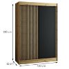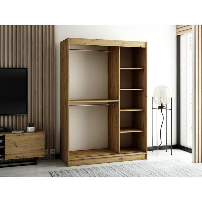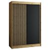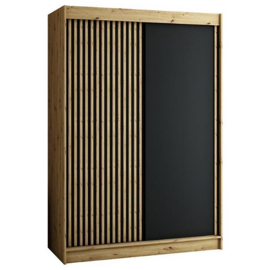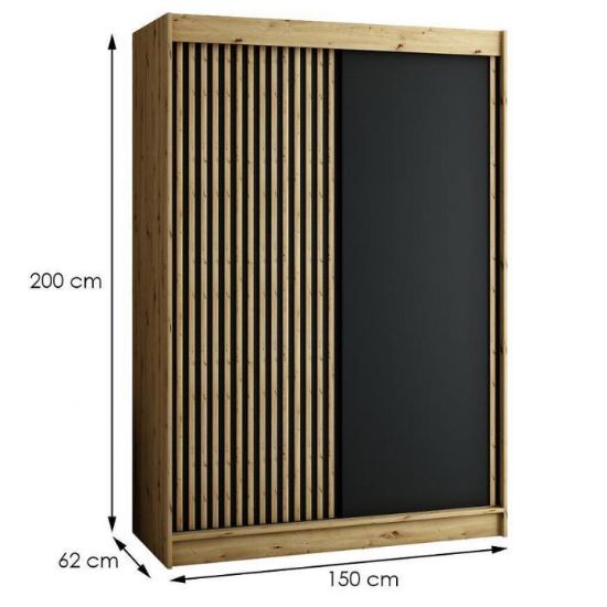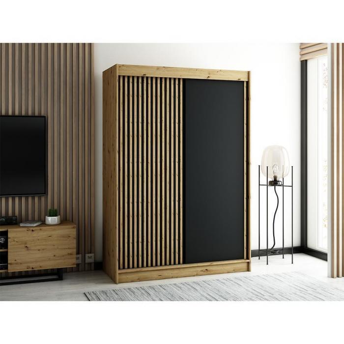 Szafa z przesuwanymi drzwiami w kolorze czarny/dąb artisan z kolekcji Lamelo to doskonała propozycja do pokoju dziennego, ale znajdzie swoje miejsce również w innym pomieszczeniu, jak na przykład w przedpokoju czy garderobie, sypialni. Wygląd szafy sprawi, że wpasuje się w większość aranżacji. Szafa będzie świetnym miejscem do wieszania ubrań. Materiał wykonania to płyta laminowana. Możliwość dokupienia szuflad.