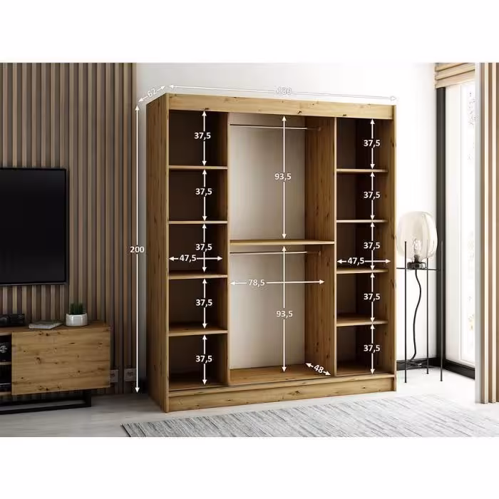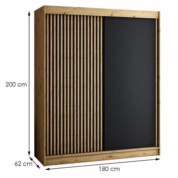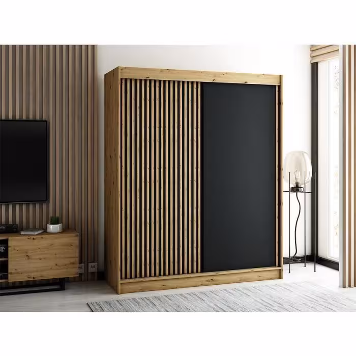 Szafa z przesuwanymi drzwiami w kolorze czarny/dąb artisan z kolekcji Lamelo to doskonała propozycja do pokoju dziennego, ale znajdzie swoje miejsce również w innym pomieszczeniu, jak na przykład w przedpokoju czy garderobie, sypialni. Wygląd szafy sprawi, że wpasuje się w większość aranżacji. Szafa będzie świetnym miejscem do wieszania ubrań. Materiał wykonania to płyta laminowana. Możliwość dokupienia szuflad.