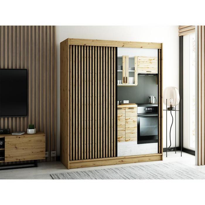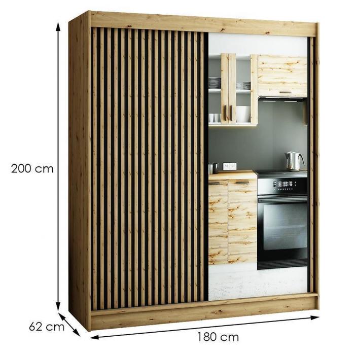 Szafa z przesuwanymi drzwiami w kolorze czarny/dąb artisan z kolekcji Lamelo to doskonała propozycja do pokoju dziennego, ale znajdzie swoje miejsce również w innym pomieszczeniu, jak na przykład w przedpokoju czy garderobie, sypialni. Pojemna szafa Lamelo posiada lustro, które sprawi, że pomieszczenie stanie się optycznie większe. Wygląd szafy sprawi, że wpasuje się w większość aranżacji. Szafa będzie świetnym miejscem do wieszania ubrań. Materiał wykonania to płyta laminowana. Możliwość dokupienia szuflad.