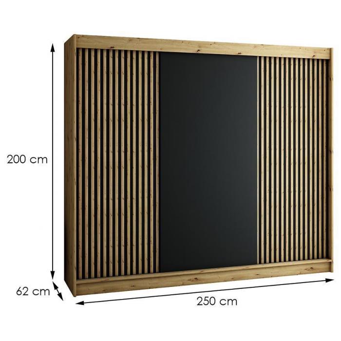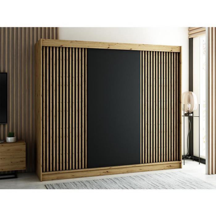 Szafa z przesuwanymi drzwiami w kolorze czarny/dąb artisan z kolekcji Lamelo to doskonała propozycja do pokoju dziennego, ale znajdzie swoje miejsce również w innym pomieszczeniu, jak na przykład w przedpokoju czy garderobie, sypialni. Wygląd szafy sprawi, że wpasuje się w większość aranżacji. Szafa będzie świetnym miejscem do wieszania ubrań. Materiał wykonania to płyta laminowana. Możliwość dokupienia szuflad.
