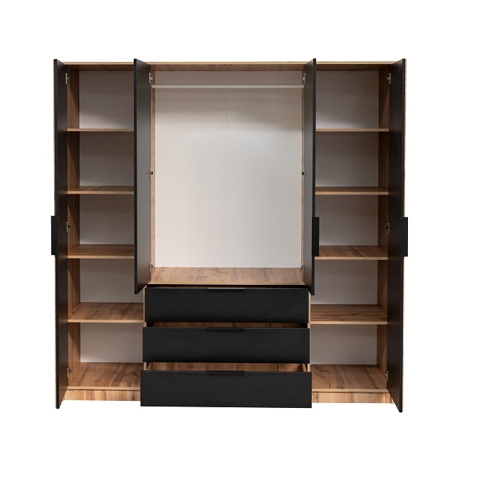 Szafa Laos D4 to propozycja do sypialni ale znajdzie swoje miejsce również w innym pomieszczeniu, jak na przykład - przedpokój czy garderoba. Materiał wykonania to płyta wiórowa laminowana. Szafa posiada osiem półek, trzy szuflady oraz drążek na ubrania. Na frontach znajdują się ozdobne lamele w kolorze czarnym oraz lustro.