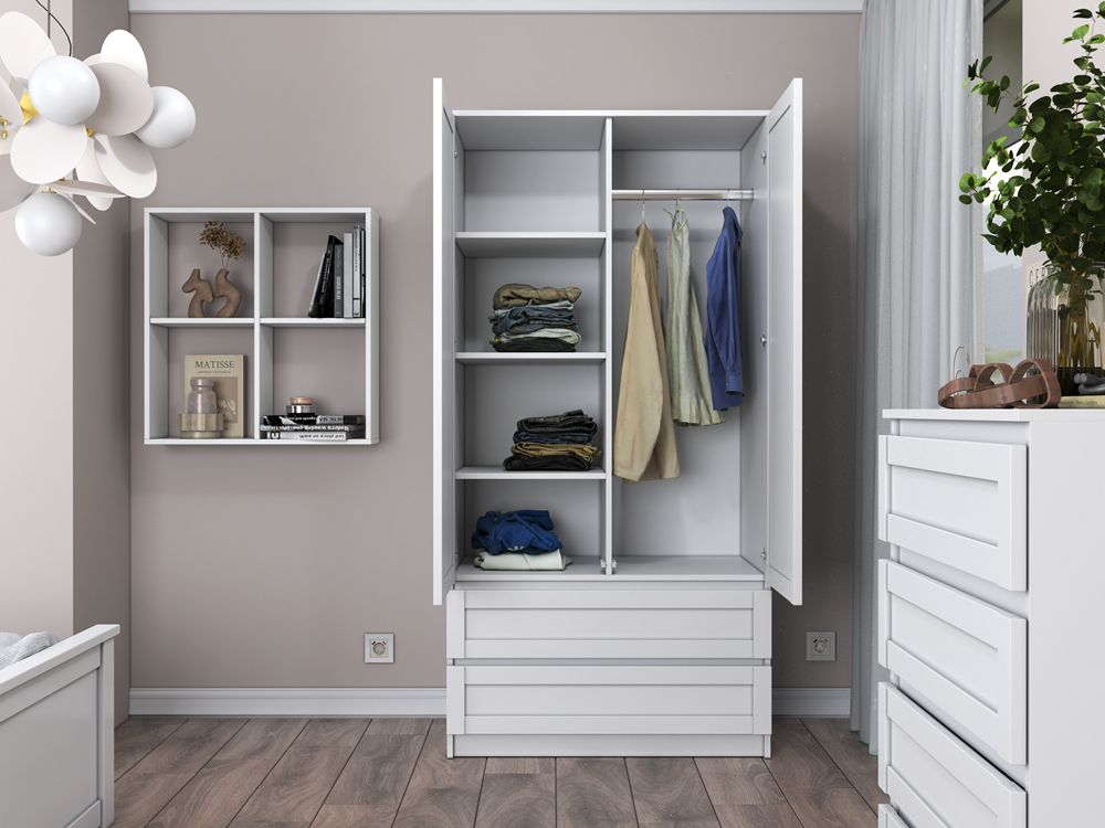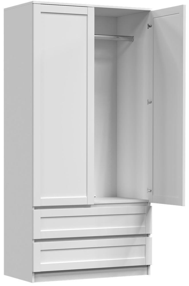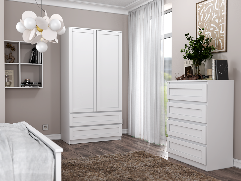 Szafa z drzwiami uchylnymi Umo RAM to doskonały wybór do garderoby, przedpokoju, salonu czy sypialni. Kolor frontów i korpusu sprawiają, że wpasuje się w większość aranżacji. Jej wnętrze jest pojemne i pomieści zarówno ubrania jak i inne akcesoria. Szafa jest 2-drzwiowa i posiada 2 szuflady. Fronty w kolorze białym są frezowane z ramkami. Możliwość montażu półek z lewej bądź prawej strony.