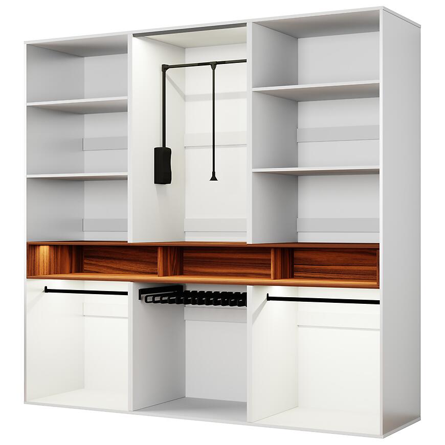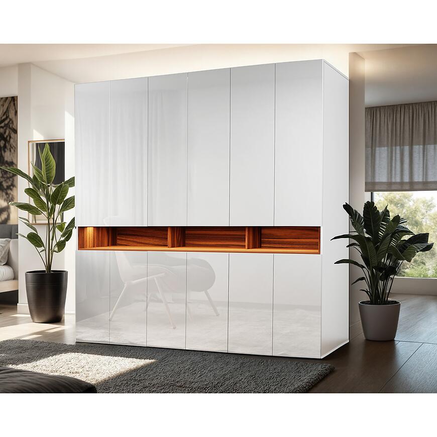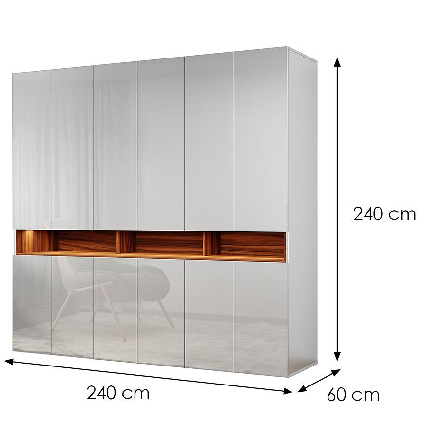 Szafa Laura 240 biała to nowoczesny, pojemny mebel o wymiarach 240×240×60 cm, wykonany z płyty wiórowej laminowanej. Posiada klasyczne, kilkudrzwiowe fronty w wykończeniu połysk, zestawione z matowym korpusem w tym samym kolorze. Szafa utrzymana jest w całości w bieli, bez luster, co nadaje jej minimalistycznego charakteru. W standardzie dostępne jest oświetlenie, które podkreśla nowoczesny styl kolekcji Laura. Solidna konstrukcja o wadze 249 kg wymaga samodzielnego złożenia.