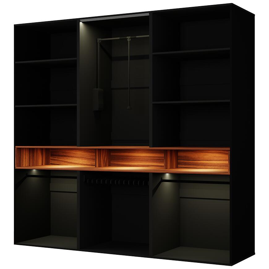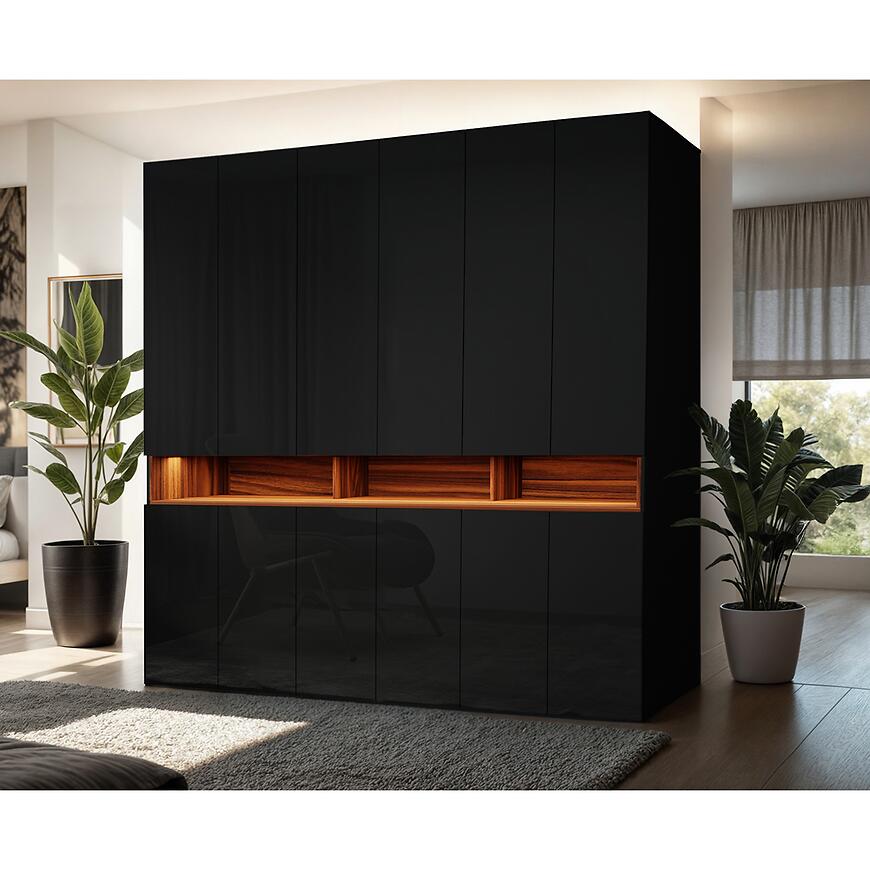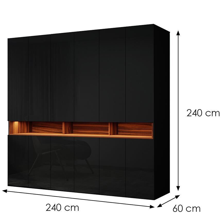 Szafa Laura 240 czarna to elegancka propozycja dla miłośników nowoczesnych wnętrz. Jej wymiary to 240×240×60 cm, a solidna konstrukcja wykonana została z płyty wiórowej laminowanej. Fronty w połysku w kolorze czerni pięknie kontrastują z matowym wykończeniem korpusu, tworząc efektowną całość. Szafa wyposażona jest w klasyczne, kilkudrzwiowe fronty, bez luster, co podkreśla jej minimalistyczny charakter. W standardzie znajduje się oświetlenie, które dodaje funkcjonalności i podkreśla walory estetyczne mebla. Całość waży 249 kg i wymaga samodzielnego złożenia.