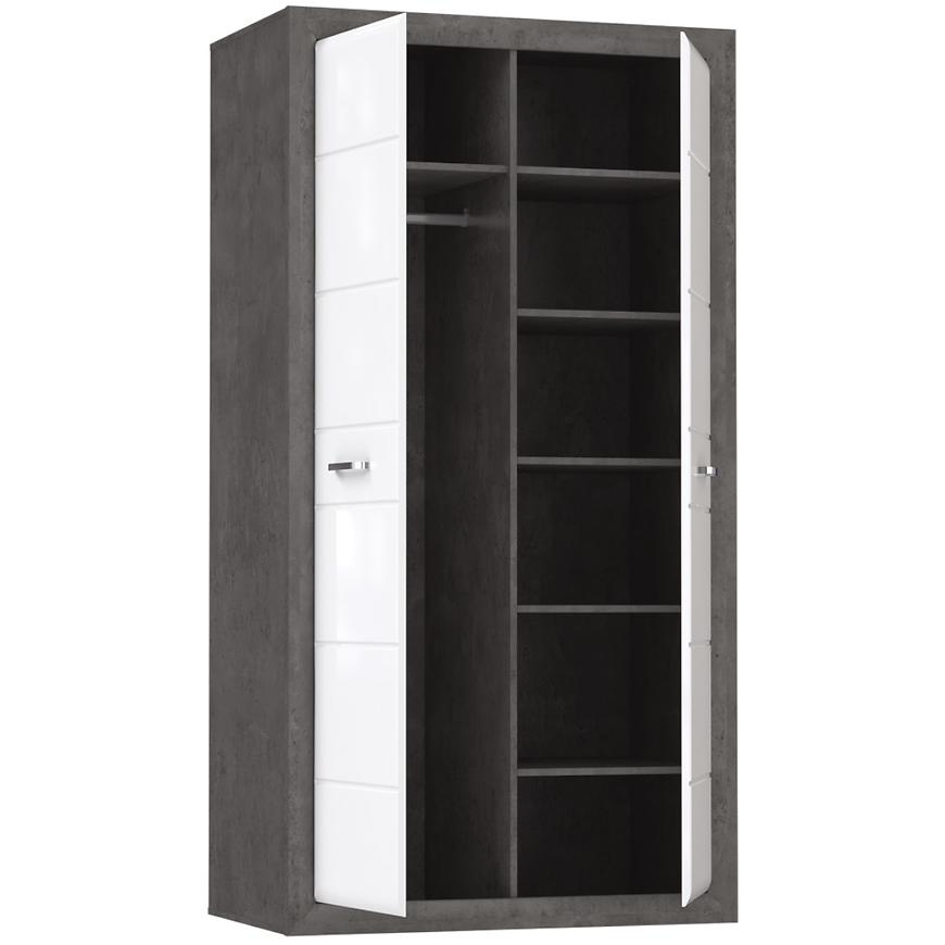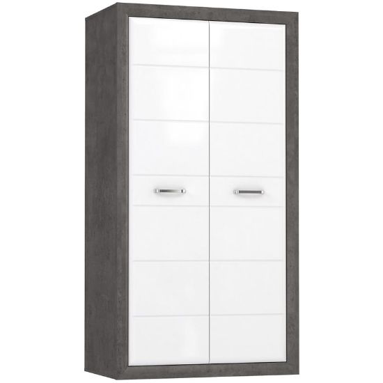 Estetyka i funkcjonalność idą tu w parze. Połyskujące fronty w kolorze białym dodają szafie elegancji i blasku, jednocześnie odbijając światło i dodając świeżości. Kontrastujący betonowy odcień korpusu w matowym wykończeniu nadaje meblowi nowoczesnego i surowego wyglądu.