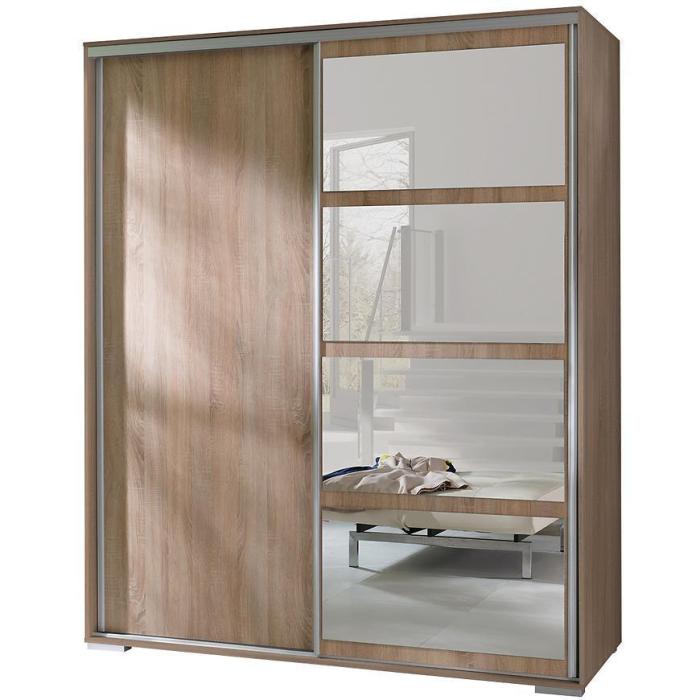Szafa Leo to propozycja do pokoju dziennego, ale znajdzie swoje miejsce również w innym pomieszczeniu, jak na przykład - przedpokój czy garderoba. Materiał wykonania to płyta wiórowa laminowana. Szafa posiada półki, szuflady oraz drążek na ubrania, a także lustro, które sprawi, że pomieszczenie stanie się optycznie większe. Nowoczesny styl mebli wpadnie do gustu każdemu, kto poszukuje eleganckiego, klasycznego, a zarazem nowoczesnego umeblowania. Idealnie wpasuje się w większość aranżacji. Przeznaczona do samodzielnego montażu.