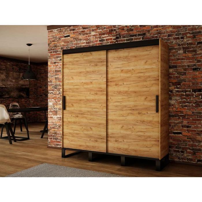 Szafa z drzwiami przesuwnymi w kolorze dąb craft złoty/czarny z kolekcji Loft to doskonała propozycja do pokoju dziennego, ale znajdzie swoje miejsce również w innym pomieszczeniu, jak na przykład w przedpokoju czy garderobie, sypialni. Materiał wykonania to płyta wiórowa laminowana. Szafa posiada półki i drążek na ubrania. Szafa przeznaczona do samodzielnego montażu. Wygląd szafy sprawi, że wpasuje się w większość aranżacji. Szafa będzie świetnym miejscem do wieszania ubrań. Możliwość dokupienia szuflad Komplet Szuflad (2SZT) 120 150 180 200 Dąb Craft Złoty.