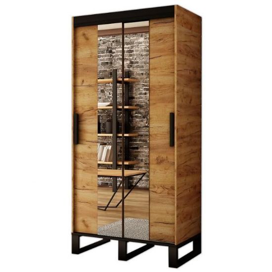 Szafa z drzwiami przesuwnymi w kolorze dąb craft złoty/czarny z kolekcji Loft to doskonała propozycja do pokoju dziennego, ale znajdzie swoje miejsce również w innym pomieszczeniu, jak na przykład w przedpokoju czy garderobie, sypialni. Materiał wykonania to płyta wiórowa laminowana. Szafa posiada półki i drążek na ubrania. Pojemna szafa posiada również lustro, które sprawi, że pomieszczenie stanie się optycznie większe. Szafa przeznaczona do samodzielnego montażu. Wygląd szafy sprawi, że wpasuje się w większość aranżacji. Szafa będzie świetnym miejscem do wieszania ubrań. Możliwość dokupienia szuflad Komplet Szuflad (2SZT) 100 Dąb Craft Złoty.