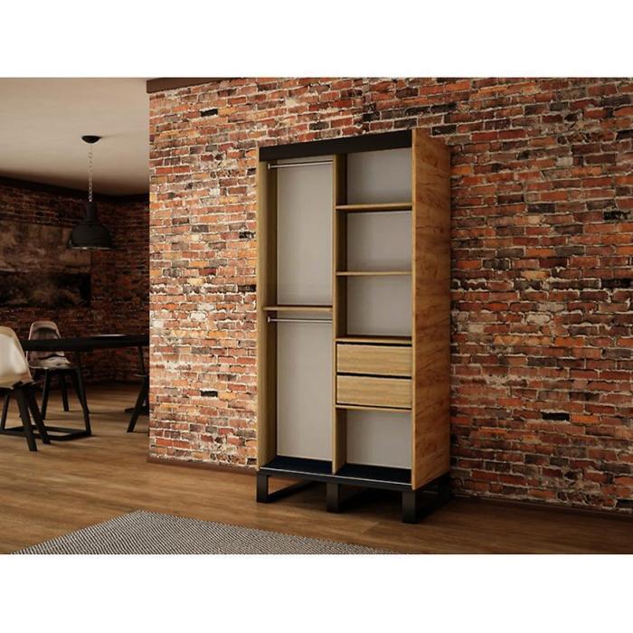 Szafa z drzwiami przesuwnymi w kolorze dąb craft złoty/czarny z kolekcji Loft to doskonała propozycja do pokoju dziennego, ale znajdzie swoje miejsce również w innym pomieszczeniu, jak na przykład w przedpokoju czy garderobie, sypialni. Materiał wykonania to płyta wiórowa laminowana. Szafa posiada półki i drążek na ubrania. Pojemna szafa posiada również lustro, które sprawi, że pomieszczenie stanie się optycznie większe. Szafa przeznaczona do samodzielnego montażu. Wygląd szafy sprawi, że wpasuje się w większość aranżacji. Szafa będzie świetnym miejscem do wieszania ubrań. Możliwość dokupienia szuflad Komplet Szuflad (2SZT) 100 Dąb Craft Złoty.