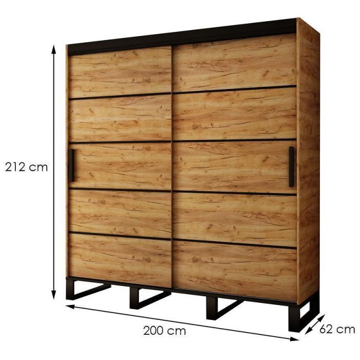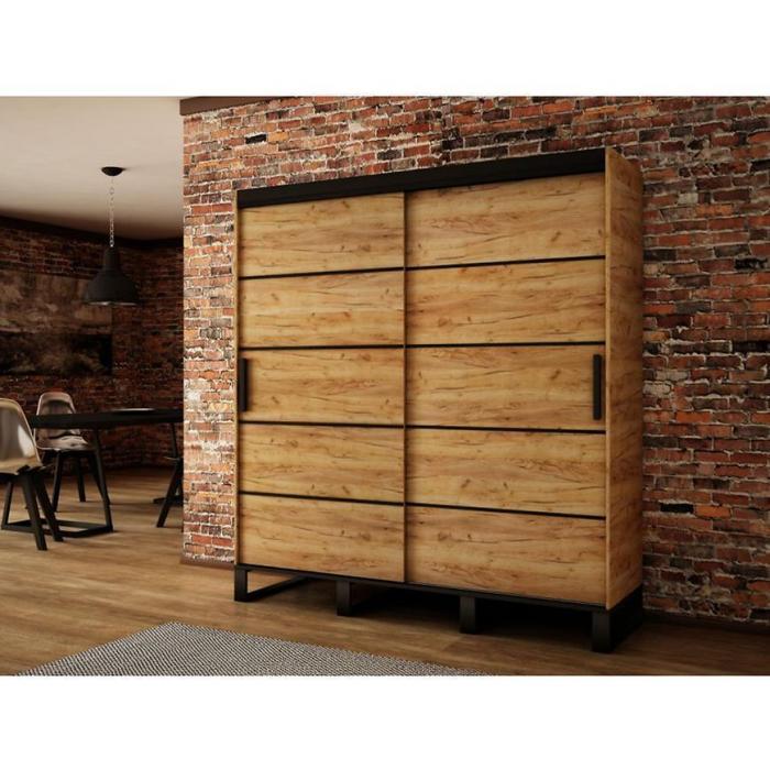 Szafa z drzwiami przesuwnymi w kolorze dąb craft złoty/czarny z kolekcji Loft to doskonała propozycja do pokoju dziennego, ale znajdzie swoje miejsce również w innym pomieszczeniu, jak na przykład w przedpokoju czy garderobie, sypialni. Materiał wykonania to płyta wiórowa laminowana. Szafa posiada półki i drążek na ubrania. Szafa przeznaczona do samodzielnego montażu. Wygląd szafy sprawi, że wpasuje się w większość aranżacji. Szafa będzie świetnym miejscem do wieszania ubrań. Możliwość dokupienia szuflad Komplet Szuflad (2SZT) 120 150 180 200 Dąb Craft Złoty.