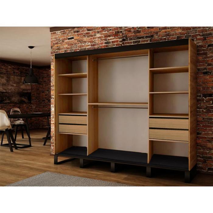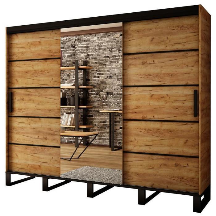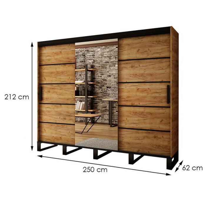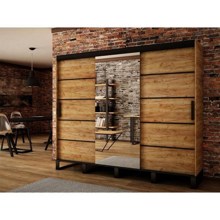 Szafa z drzwiami przesuwnymi w kolorze dąb craft złoty/czarny z kolekcji Loft to doskonała propozycja do pokoju dziennego, ale znajdzie swoje miejsce również w innym pomieszczeniu, jak na przykład w przedpokoju czy garderobie, sypialni. Materiał wykonania to płyta wiórowa laminowana. Szafa posiada półki i drążek na ubrania. Pojemna szafa posiada również lustro, które sprawi, że pomieszczenie stanie się optycznie większe. Szafa przeznaczona do samodzielnego montażu. Wygląd szafy sprawi, że wpasuje się w większość aranżacji. Szafa będzie świetnym miejscem do wieszania ubrań. Możliwość dokupienia szuflad Komplet Szuflad (2SZT) 250 Dąb Craft Złoty.