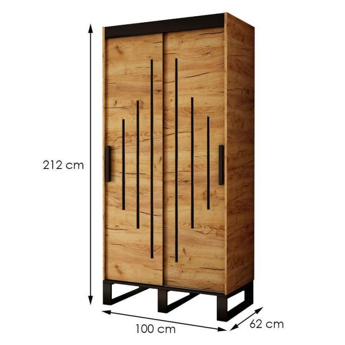 Szafa z drzwiami przesuwnymi w kolorze dąb craft złoty/czarny z kolekcji Loft to doskonała propozycja do pokoju dziennego, ale znajdzie swoje miejsce również w innym pomieszczeniu, jak na przykład w przedpokoju czy garderobie, sypialni. Materiał wykonania to płyta wiórowa laminowana. Szafa posiada półki i drążek na ubrania. Szafa przeznaczona do samodzielnego montażu. Wygląd szafy sprawi, że wpasuje się w większość aranżacji. Szafa będzie świetnym miejscem do wieszania ubrań. Możliwość dokupienia szuflad Komplet Szuflad (2SZT) 100 Dąb Craft Złoty.