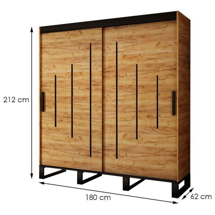 Szafa z drzwiami przesuwnymi w kolorze dąb craft złoty/czarny z kolekcji Loft to doskonała propozycja do pokoju dziennego, ale znajdzie swoje miejsce również w innym pomieszczeniu, jak na przykład w przedpokoju czy garderobie, sypialni. Materiał wykonania to płyta wiórowa laminowana. Szafa posiada półki i drążek na ubrania. Szafa przeznaczona do samodzielnego montażu. Wygląd szafy sprawi, że wpasuje się w większość aranżacji. Szafa będzie świetnym miejscem do wieszania ubrań. Możliwość dokupienia szuflad Komplet Szuflad (2SZT) 120 150 180 200 Dąb Craft Złoty.