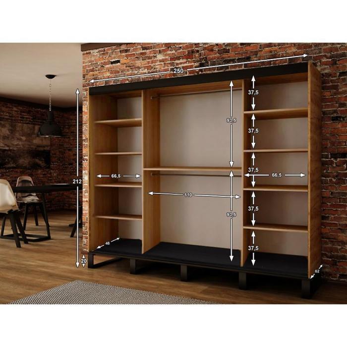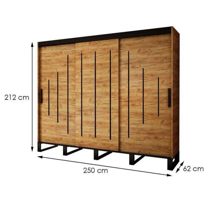 Szafa z drzwiami przesuwnymi w kolorze dąb craft złoty/czarny z kolekcji Loft to doskonała propozycja do pokoju dziennego, ale znajdzie swoje miejsce również w innym pomieszczeniu, jak na przykład w przedpokoju czy garderobie, sypialni. Materiał wykonania to płyta wiórowa laminowana. Szafa posiada półki i drążek na ubrania. Szafa przeznaczona do samodzielnego montażu. Wygląd szafy sprawi, że wpasuje się w większość aranżacji. Szafa będzie świetnym miejscem do wieszania ubrań. Możliwość dokupienia szuflad Komplet Szuflad (2SZT) 250 Dąb Craft Złoty.