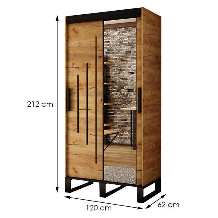 Szafa z drzwiami przesuwnymi w kolorze dąb craft złoty/czarny z kolekcji Loft to doskonała propozycja do pokoju dziennego, ale znajdzie swoje miejsce również w innym pomieszczeniu, jak na przykład w przedpokoju czy garderobie, sypialni. Materiał wykonania to płyta wiórowa laminowana. Szafa posiada półki i drążek na ubrania. Pojemna szafa posiada również lustro, które sprawi, że pomieszczenie stanie się optycznie większe. Szafa przeznaczona do samodzielnego montażu. Wygląd szafy sprawi, że wpasuje się w większość aranżacji. Szafa będzie świetnym miejscem do wieszania ubrań. Możliwość dokupienia szuflad Komplet Szuflad (2SZT) 120 150 180 200 Dąb Craft Złoty.