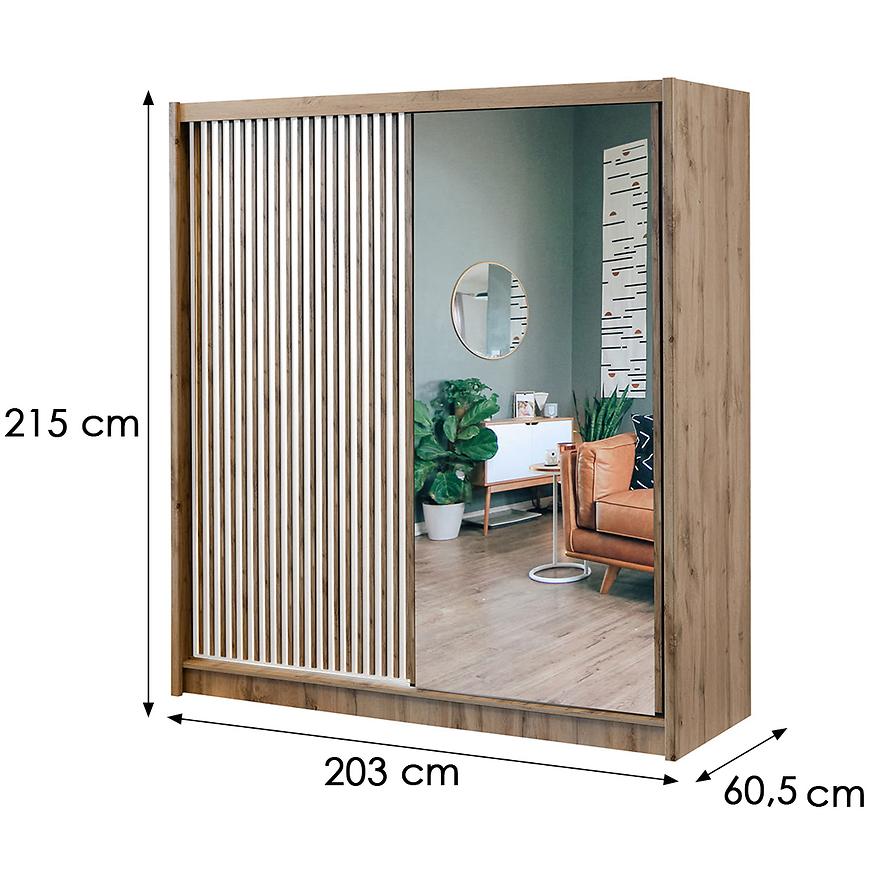 Na froncie szafy znajduje się lustro, które optycznie powiększa wnętrze i dodaje mu lekkości. Połączenie kolorów dąb wotan i biały w matowym wykończeniu nadaje elegancji i harmonii, doskonale komponując się zarówno z jasnymi, jak i ciemnymi aranżacjami.