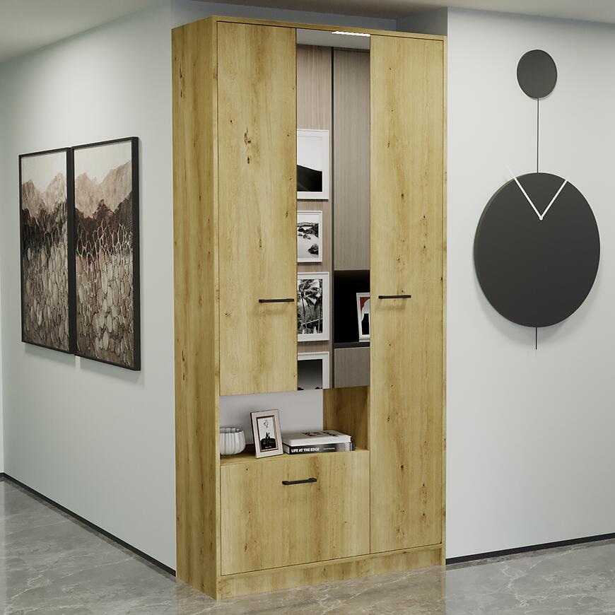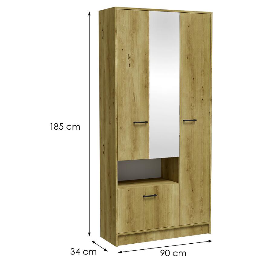 Szafa London Artisan ma wymiary 90 cm szerokości, 185 cm wysokości i 34 cm głębokości. Jest to nowoczesny mebel trzydrzwiowy z klasycznymi drzwiami, z czego środkowe wyposażone jest w praktyczne lustro. Zarówno korpus, jak i fronty wykonane są z płyty wiórowej laminowanej w kolorze dąb artisan, wykończonej w macie. Szafa wyróżnia się prostą formą i jasnym drewnopodobnym wybarwieniem, które nadaje jej lekkości i elegancji. Mebel nie posiada oświetlenia, waży 55 kg i wymaga samodzielnego złożenia. Należy do kolekcji LONDON i stanowi praktyczne rozwiązanie do przechowywania w nowoczesnych wnętrzach.