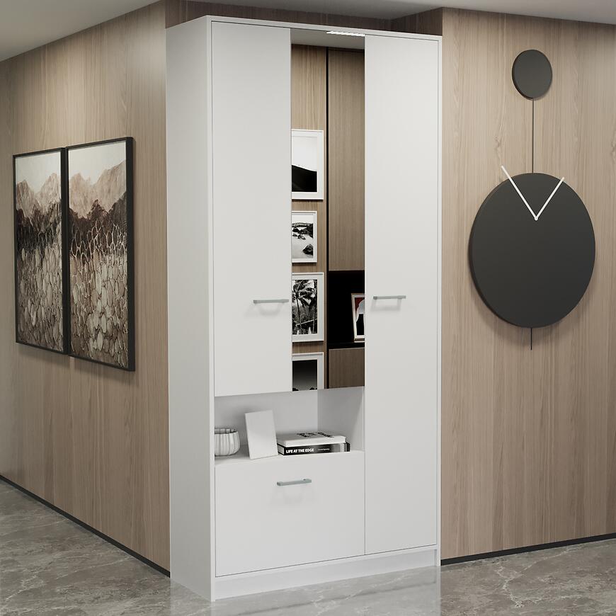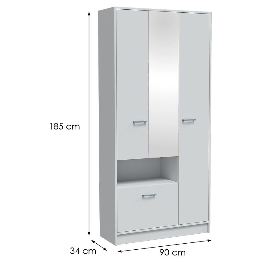 Szafa London biała to nowoczesny mebel o wymiarach 90 cm szerokości, 185 cm wysokości i 34 cm głębokości. Wyposażona jest w trzy klasyczne drzwi, z czego środkowe zawiera lustro, które optycznie powiększa przestrzeń i zwiększa funkcjonalność mebla. Zarówno fronty, jak i korpus wykonane zostały z płyty wiórowej laminowanej w kolorze białym, a ich matowe wykończenie podkreśla elegancki i uniwersalny charakter szafy. Konstrukcja jest prosta i lekka wizualnie, dzięki czemu świetnie komponuje się z nowoczesnymi aranżacjami wnętrz. Szafa nie posiada oświetlenia, waży 55 kg i wymaga samodzielnego złożenia. Należy do kolekcji LONDON i sprawdzi się jako praktyczny element wyposażenia sypialni, przedpokoju czy garderoby.