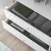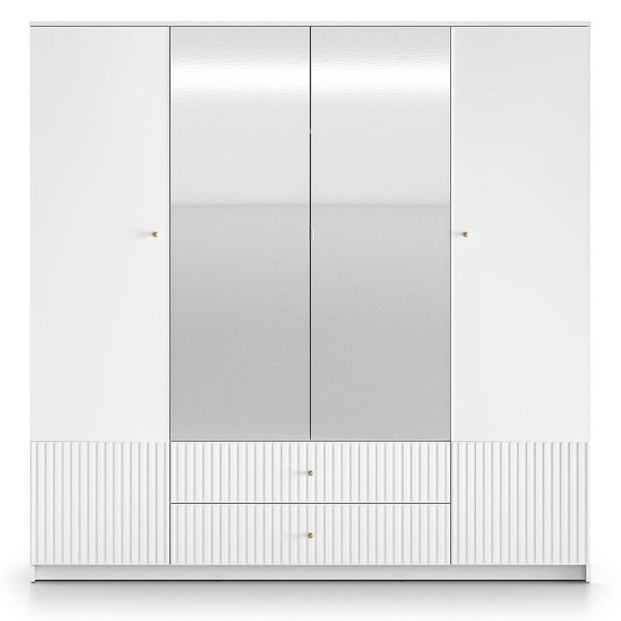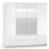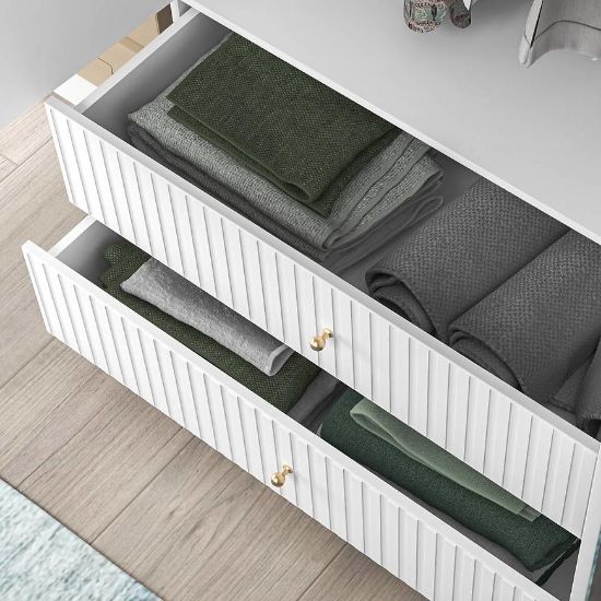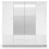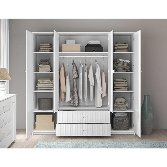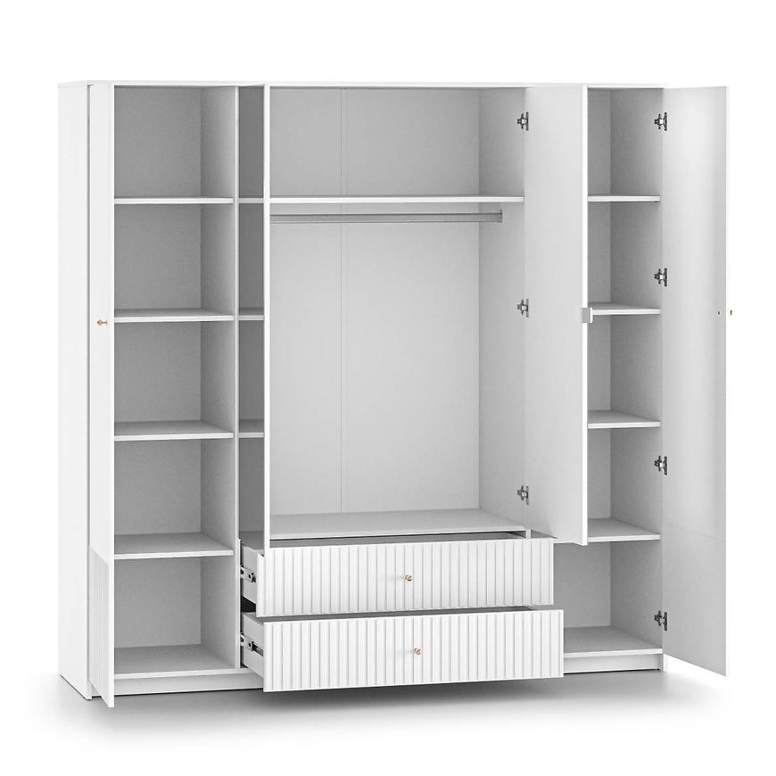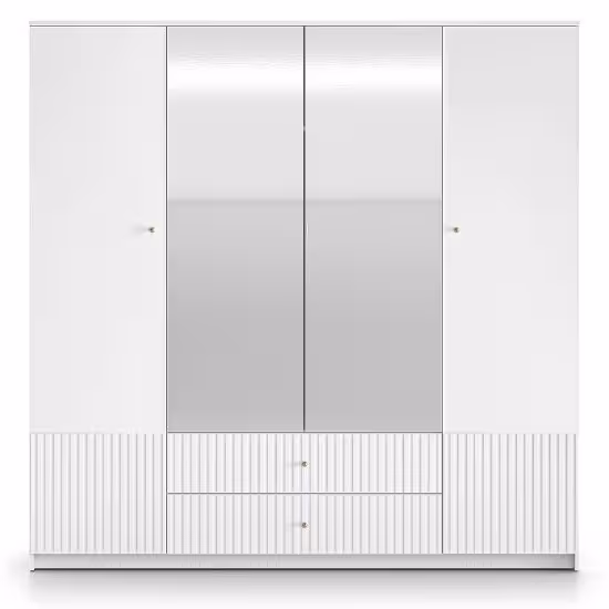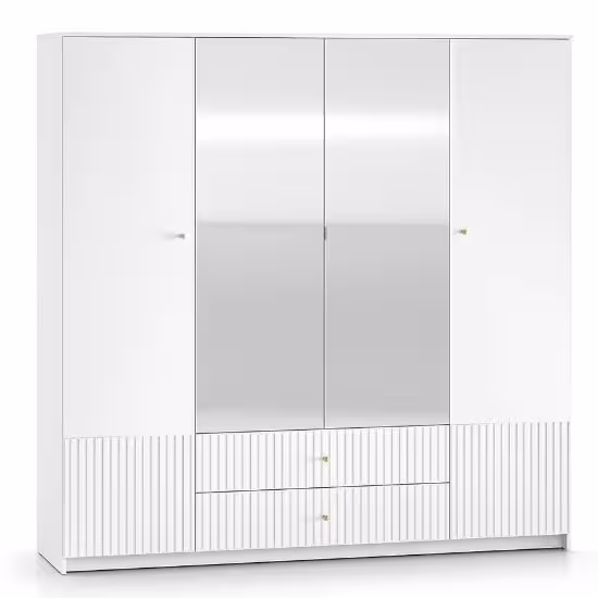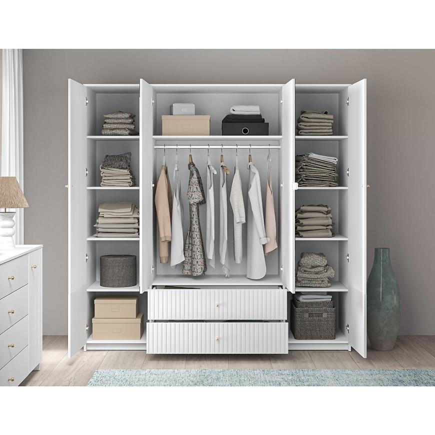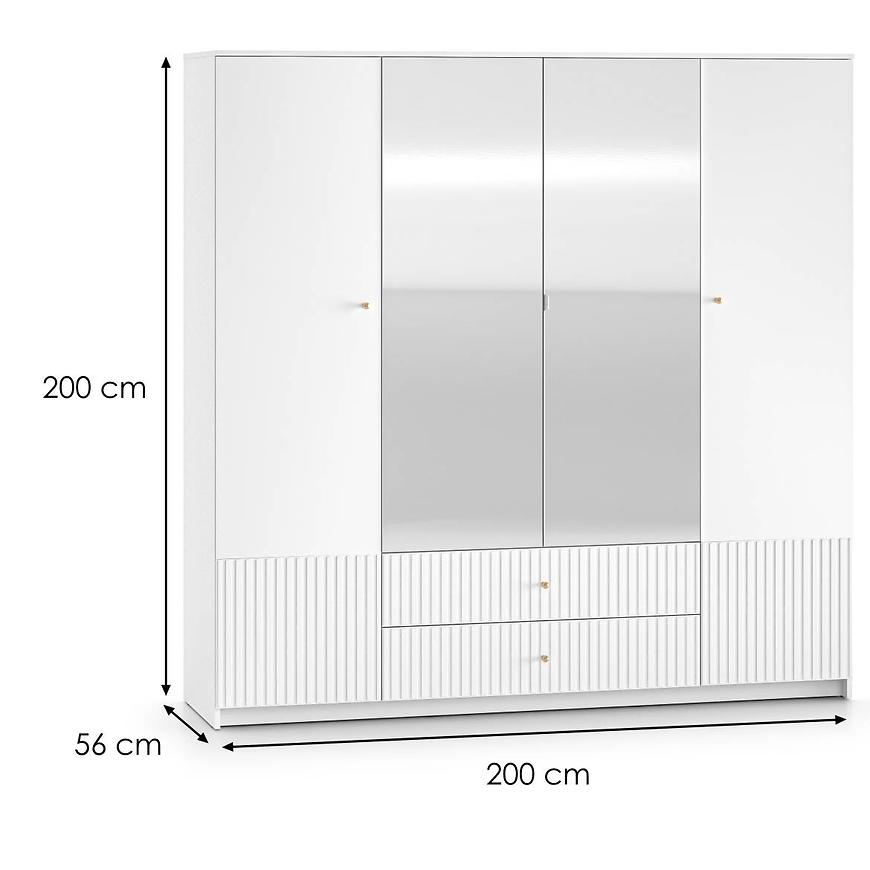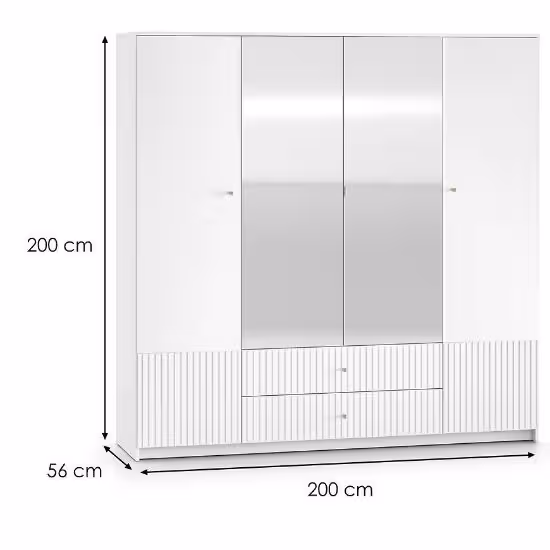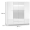 Fronty szafy wykonane są z płyty wiórowej laminowanej oraz płyty MDF, co zapewnia trwałość i solidność konstrukcji. Białe, matowe wykończenie dodaje nowoczesnego charakteru i sprawia, że szafa harmonijnie wpasowuje się w różne style aranżacji wnętrz.