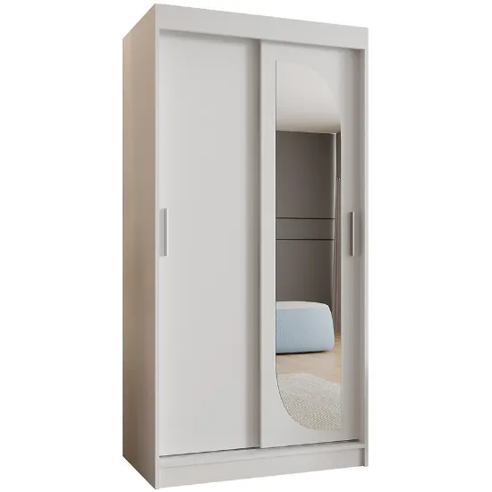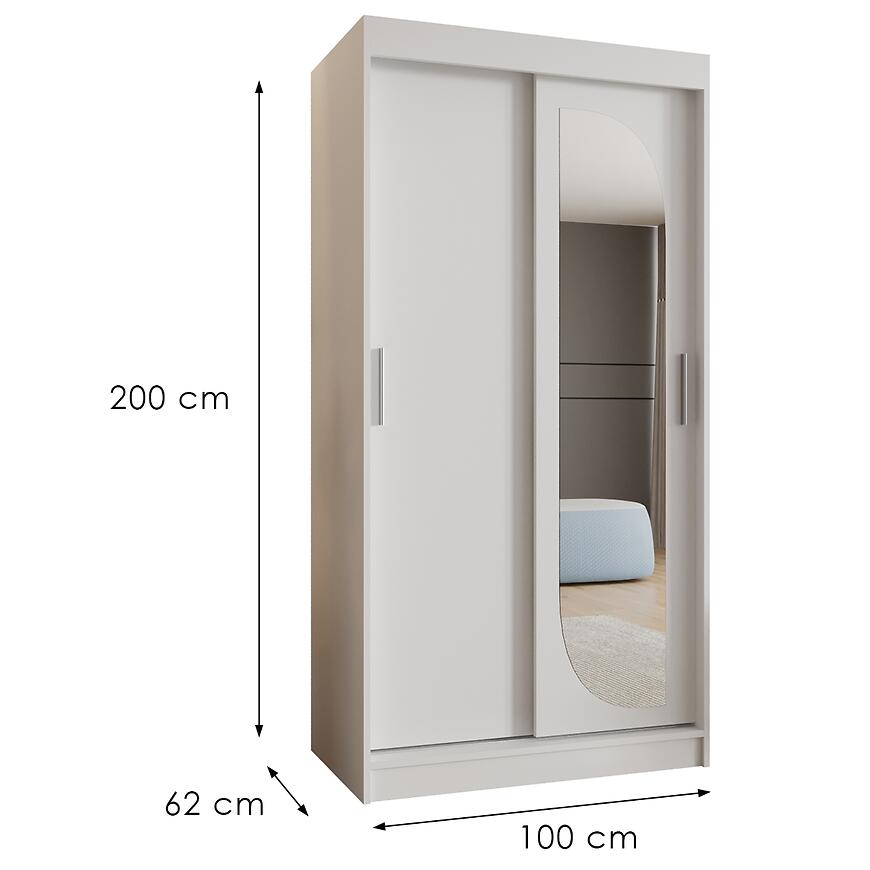 Szafa LUCY 100 biały to funkcjonalny i stylowy mebel do wnętrz w nowoczesnym stylu. Dwudrzwiowa konstrukcja z drzwiami przesuwnymi zapewnia wygodne użytkowanie nawet w ograniczonej przestrzeni. Lustro umieszczone na froncie optycznie powiększa pomieszczenie, wprowadzając do sypialni lub garderoby jasny i przestronny wygląd.