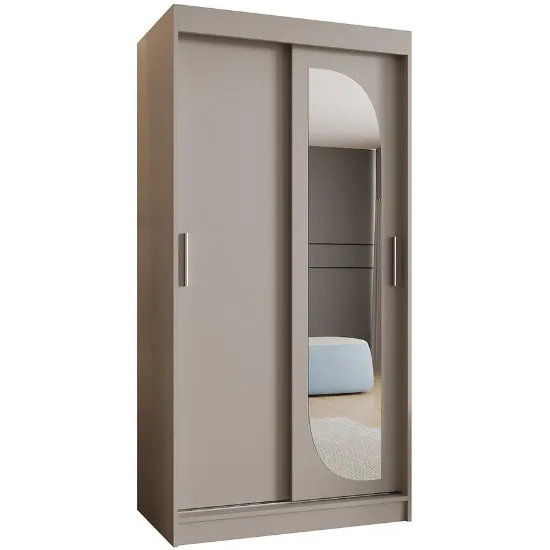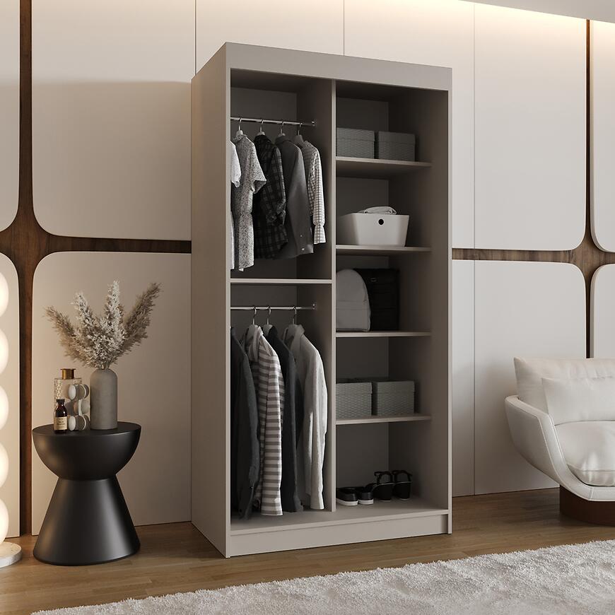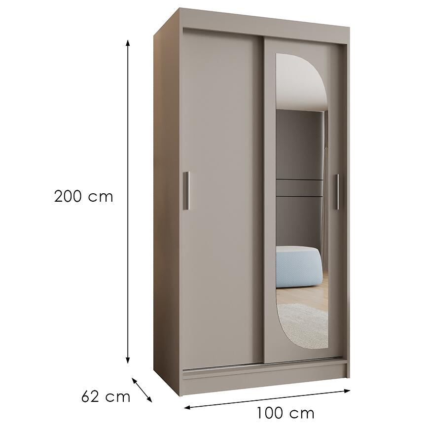 Szafa LUCY 100 kaszmir to stylowy i funkcjonalny mebel do wnętrz w nowoczesnym stylu. Dwudrzwiowa konstrukcja z drzwiami przesuwnymi zapewnia wygodne użytkowanie w pomieszczeniach o ograniczonej przestrzeni. Lustro umieszczone na froncie optycznie powiększa wnętrze, wprowadzając przestronność i elegancję do sypialni lub garderoby.
