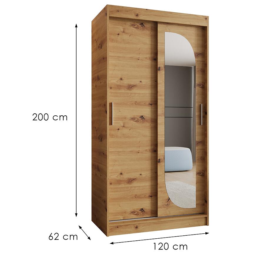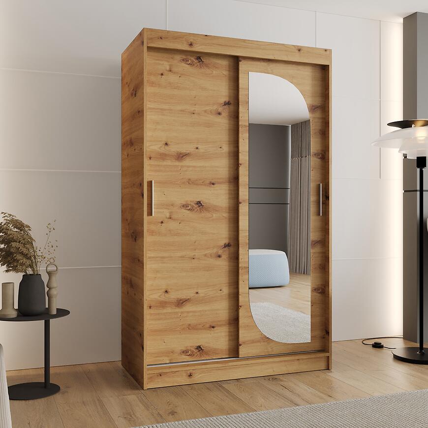 Szafa LUCY 120 artisan to elegancki i praktyczny mebel do wnętrz w nowoczesnym stylu. Dwudrzwiowa konstrukcja z drzwiami przesuwnymi zapewnia wygodne użytkowanie nawet w ograniczonej przestrzeni. Lustro umieszczone na froncie optycznie powiększa pomieszczenie, dodając przestronności i jasnego akcentu do sypialni lub garderoby.