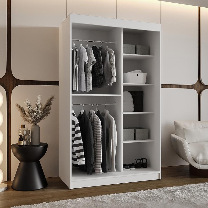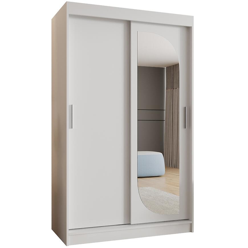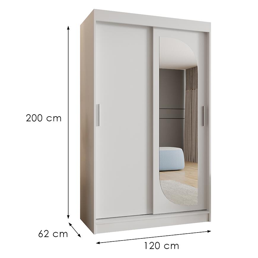 Szafa LUCY 120 biały to stylowy i funkcjonalny mebel do wnętrz w nowoczesnym stylu. Dwudrzwiowa konstrukcja z drzwiami przesuwnymi zapewnia wygodne użytkowanie, nawet w pomieszczeniach o ograniczonej przestrzeni. Lustro umieszczone na froncie optycznie powiększa wnętrze, wprowadzając jasny i przestronny akcent do sypialni lub garderoby.