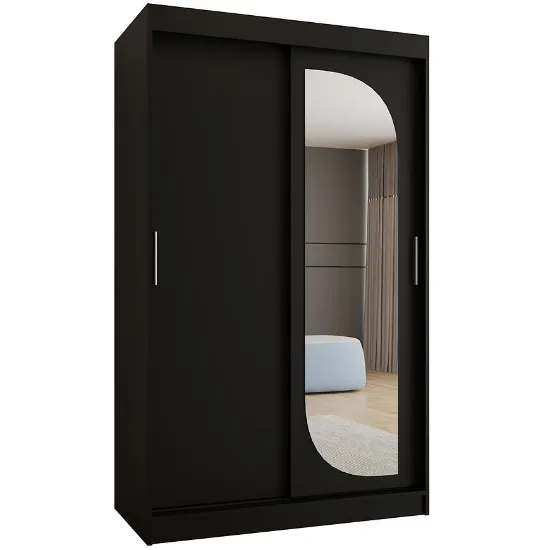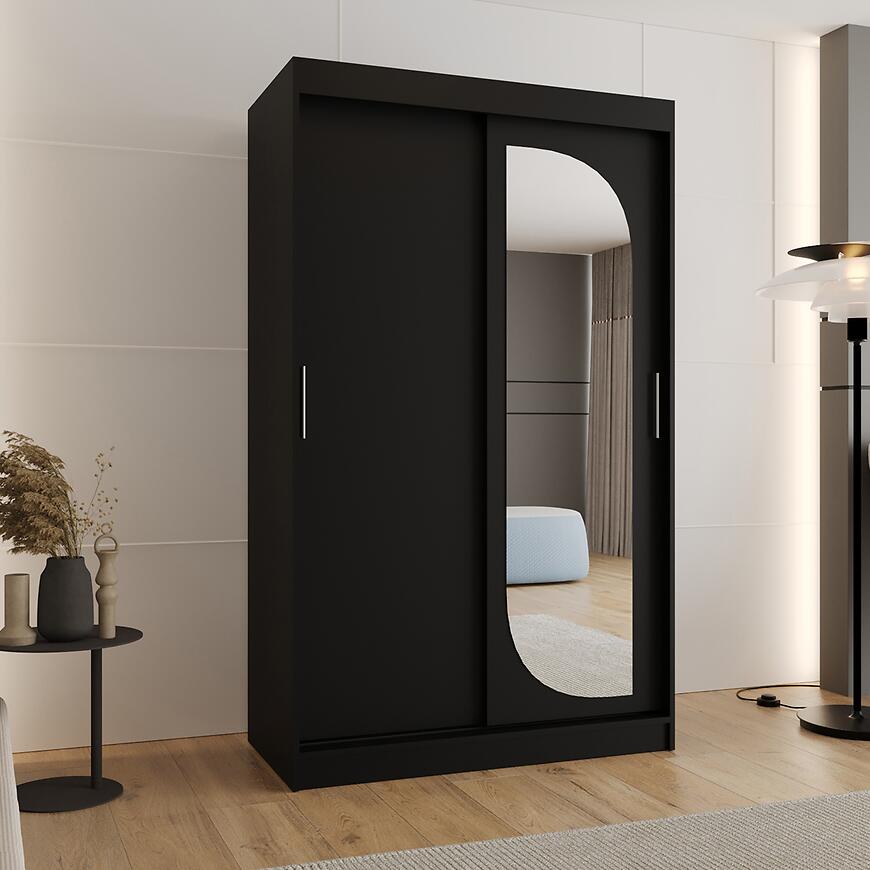 Szafa LUCY 120 czarny to stylowy i praktyczny mebel do wnętrz w nowoczesnym stylu. Dwudrzwiowa konstrukcja z drzwiami przesuwnymi zapewnia wygodne użytkowanie, nawet w pomieszczeniach o ograniczonej przestrzeni. Lustro na froncie optycznie powiększa przestrzeń, wprowadzając elegancję i nowoczesny akcent do sypialni lub garderoby.