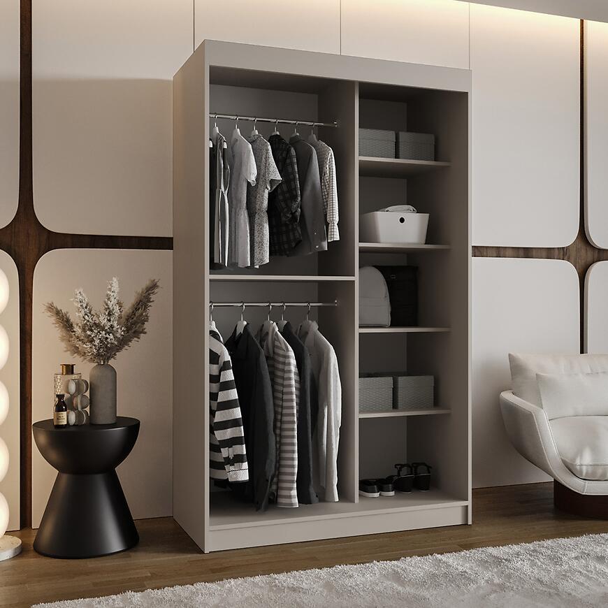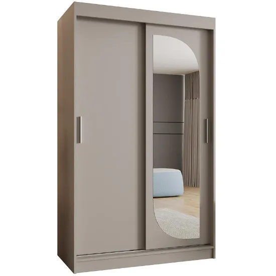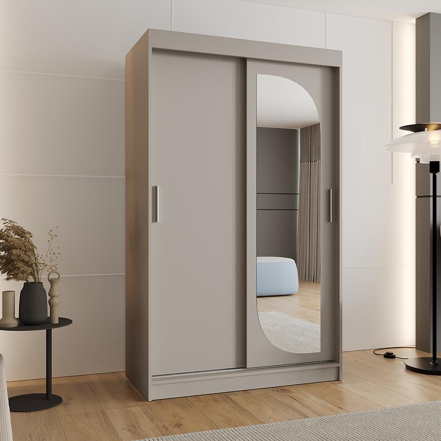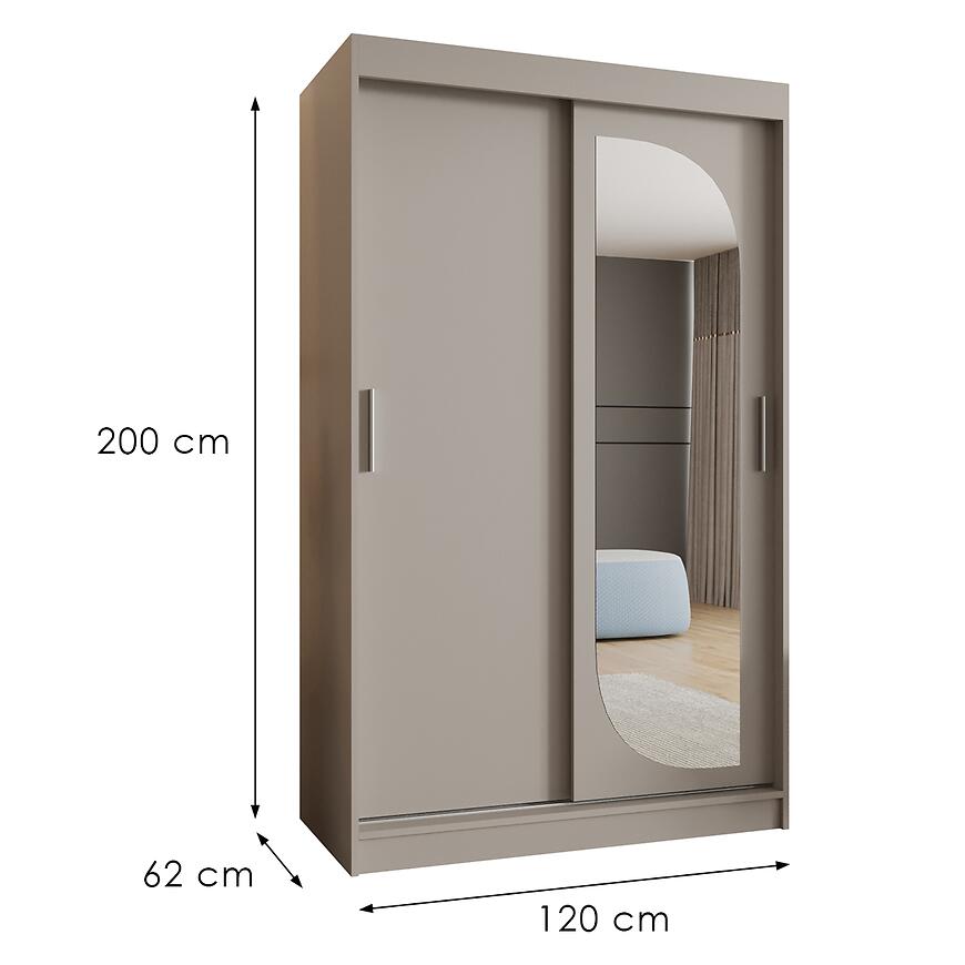 Szafa LUCY 120 kaszmir to stylowy i praktyczny mebel do wnętrz w nowoczesnym stylu. Dwudrzwiowa konstrukcja z drzwiami przesuwnymi zapewnia wygodne użytkowanie nawet w pomieszczeniach o ograniczonej przestrzeni. Lustro umieszczone na froncie optycznie powiększa wnętrze, wprowadzając przestronność i ciepły akcent do sypialni lub garderoby.