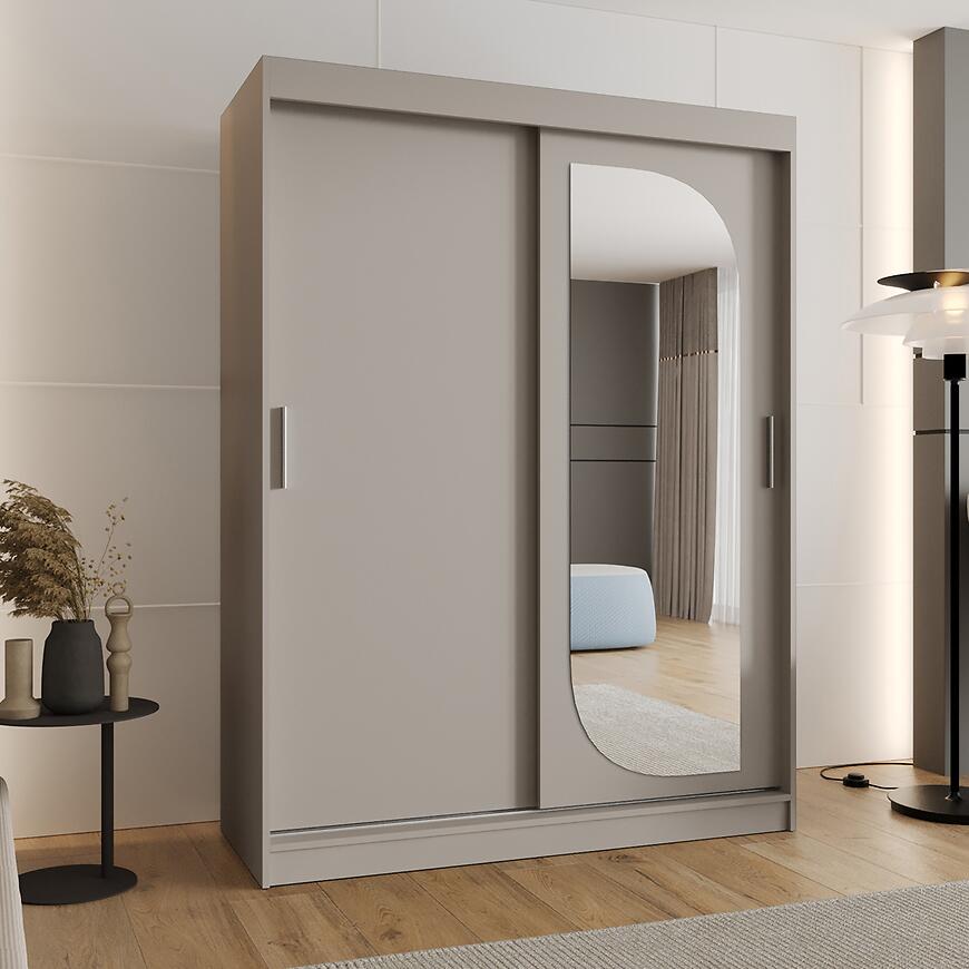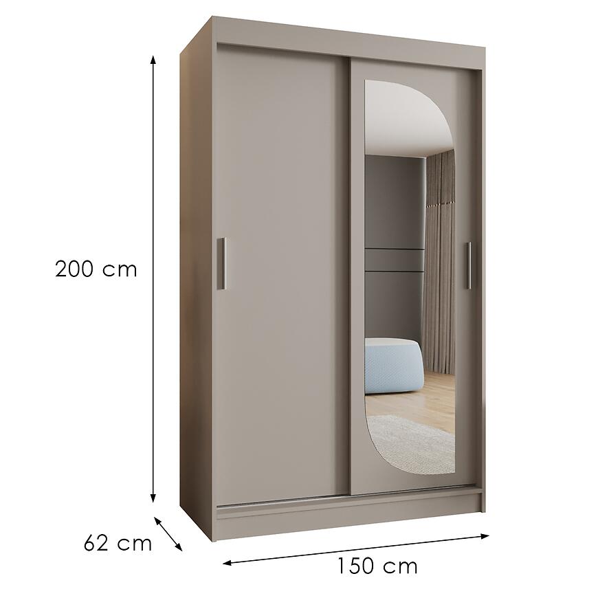 Szafa Lucy 150 kaszmir to funkcjonalna szafa z drzwiami przesuwnymi i lustrem, łącząca nowoczesną stylistykę, matowe wykończenie oraz uniwersalną kolorystykę, która sprawdzi się jako praktyczne i estetyczne rozwiązanie do przechowywania.