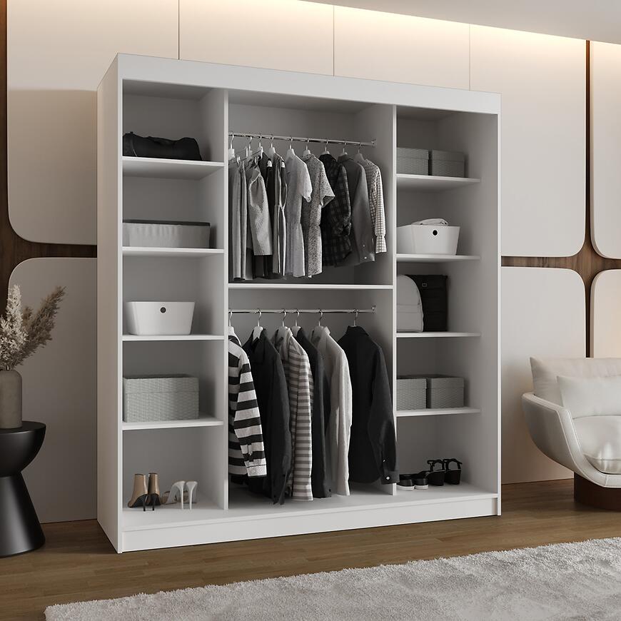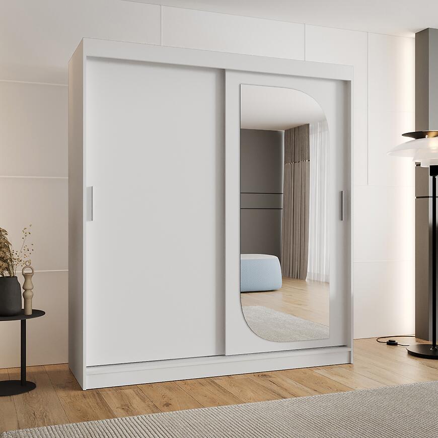Szafa Lucy 180 biały to funkcjonalna szafa z drzwiami przesuwnymi i lustrem, łącząca nowoczesny design, matowe wykończenie oraz trwałe materiały, stanowiąc estetyczne i praktyczne rozwiązanie do przechowywania.
