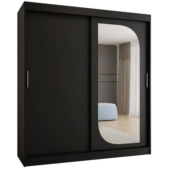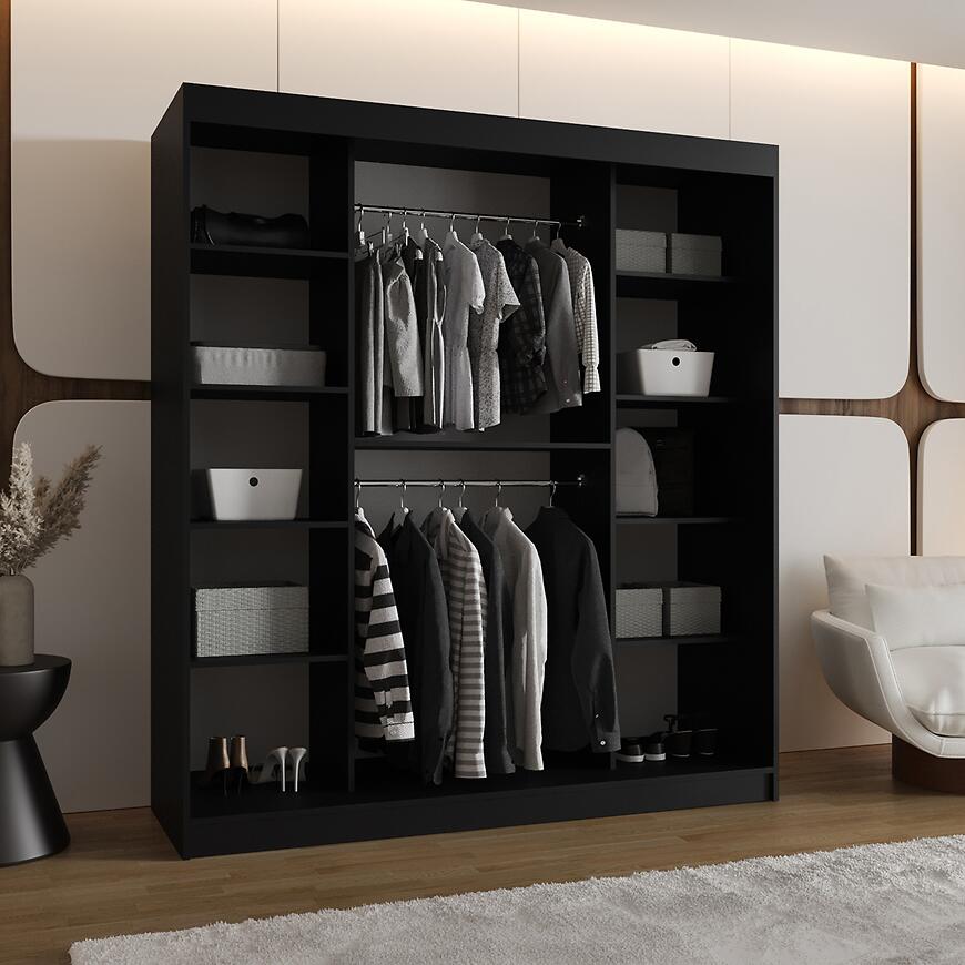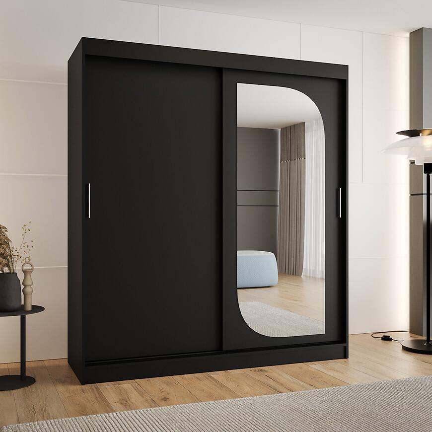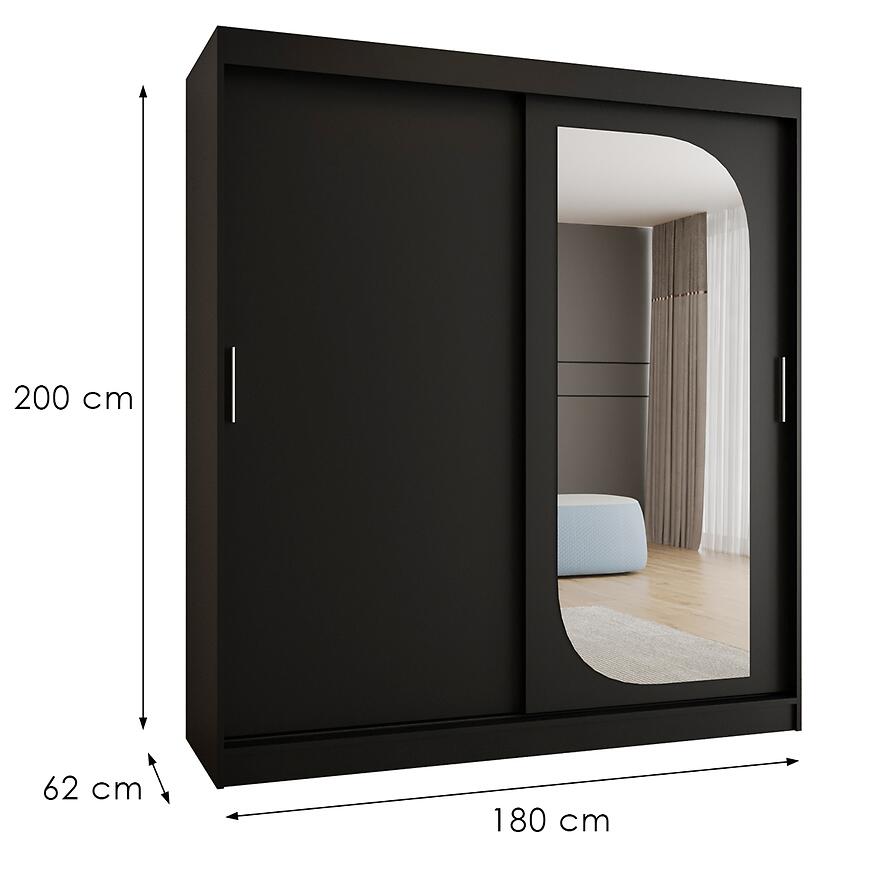 Szafa Lucy 180 czarny to funkcjonalna szafa z drzwiami przesuwnymi i lustrem, która łączy nowoczesny design, eleganckie wykończenie i trwałe materiały, oferując pojemne i estetyczne rozwiązanie do przechowywania.