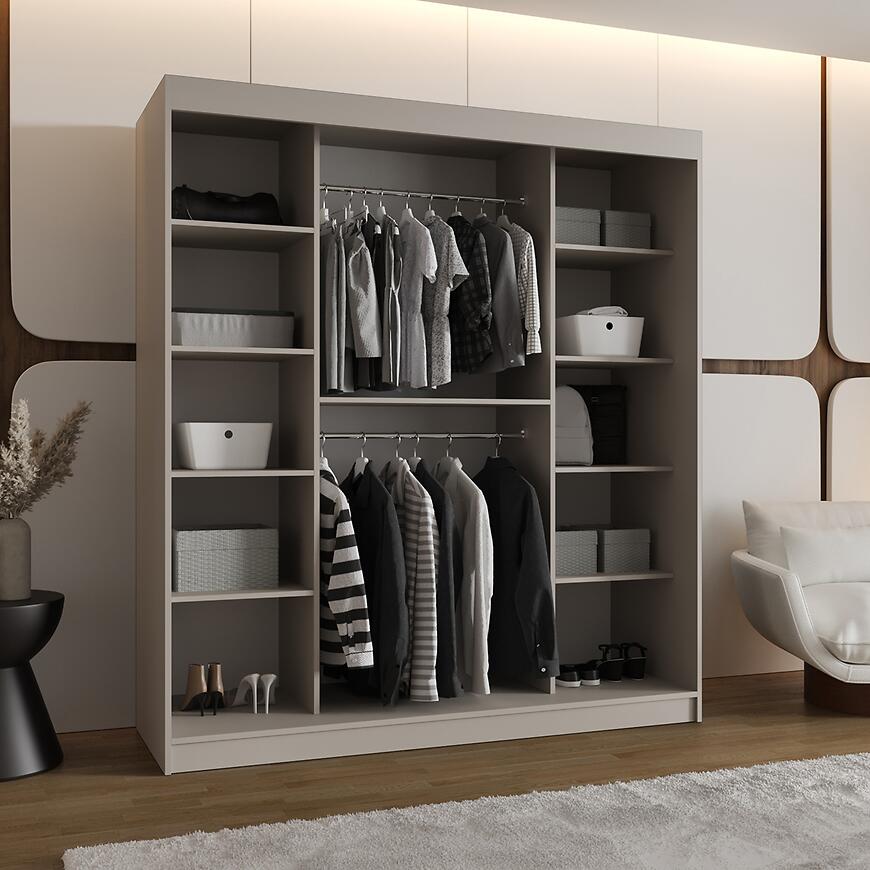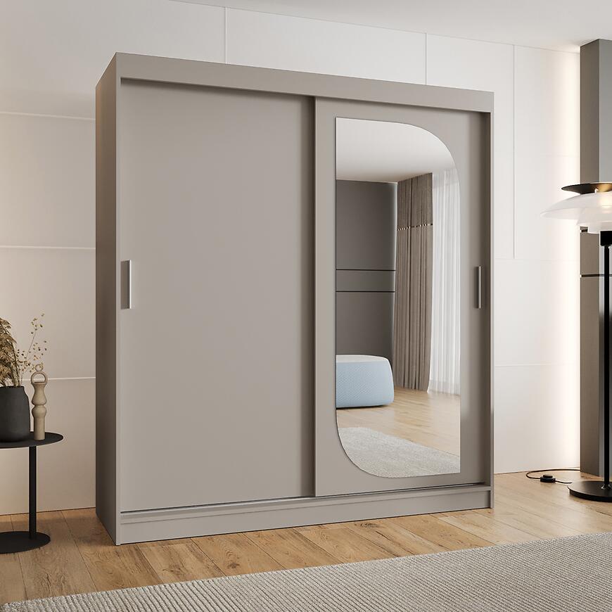 Szafa Lucy 180 kaszmir to funkcjonalna szafa z drzwiami przesuwnymi i lustrem, łącząca nowoczesny design, elegancki kolor i trwałe materiały, oferując estetyczne i praktyczne rozwiązanie do przechowywania.