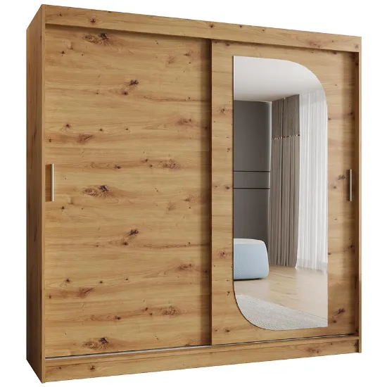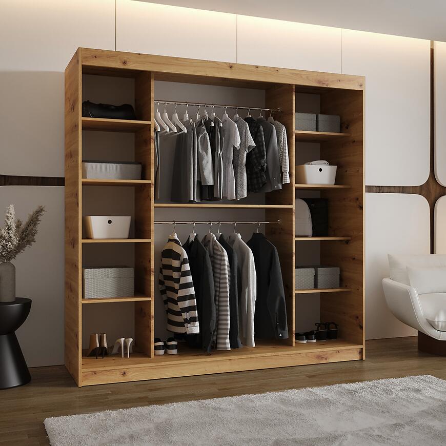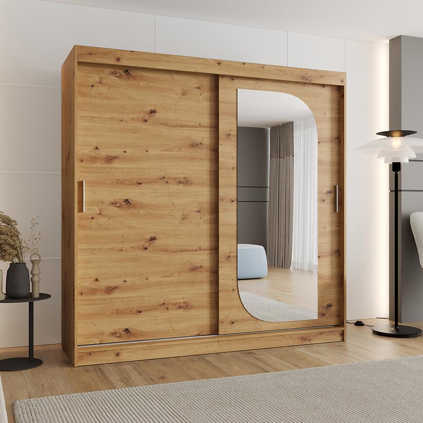 Szafa Lucy 200 artisan to funkcjonalna szafa z drzwiami przesuwnymi i lustrem, łącząca nowoczesny design, naturalny dekor drewna oraz trwałe materiały, tworząc estetyczne i praktyczne rozwiązanie do przechowywania.