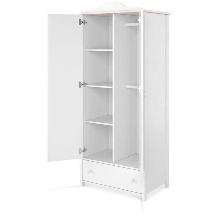 Szafa z serii Luna to doskonała propozycja do pokoju dziennego, ale znajdzie swoje miejsce również w innym pomieszczeniu, jak na przykład - przedpokój czy garderobie, sypialni. Bryła w kolorze alpejskiej bieli, różowe detale oraz oryginalne wykończenie z charakterystyczną miękką falą tworzą niepowtarzalny charakter mebla, który spodoba się mniejszym i większym romantyczkom. Materiał wykonania to płyta laminowana wykończonej trwałym obrzeżem ABS. Uchwyty z tworzywa. Dwudrzwiowa szafa na ubrania z dwoma drążkami, regałem z półkami i pojemną łatwodostępną szufladą. Wygląd szafy sprawi, że wpasuje się w większość aranżacji. Szafa będzie świetnym miejscem do wieszania ubrań, na buty lub inne domowe tekstylia. Nowoczesny styl mebli wpadnie do gustu każdemu, kto poszukuje eleganckiego, klasycznego, a zarazem nowoczesnego umeblowania. Idealnie wpasuje się w większość aranżacji. Szafa przeznaczona do samodzielnego montażu.