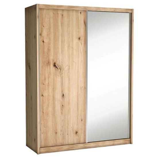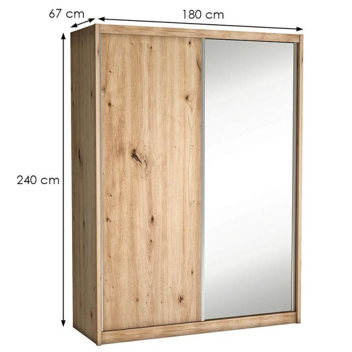 Szafa w kolorze dąb artisan z serii Maciej to doskonała propozycja do pokoju dziennego, ale znajdzie swoje miejsce również w innym pomieszczeniu, jak na przykład - przedpokój czy garderobie, sypialni. Materiał wykonania to płyta laminowana. Szafa posiada półki, drążek na ubrania oraz szuflady, a także lustro, które sprawi, że pomieszczenie stanie się optycznie większe. Mebel będzie świetnym miejscem do wieszania ubrań, na buty lub inne domowe tekstylia. Styl mebli wpadnie do gustu każdemu, kto poszukuje eleganckiego, klasycznego, a zarazem nowoczesnego umeblowania. Idealnie wpasuje się w większość aranżacji. Szafa przeznaczona do samodzielnego montażu.