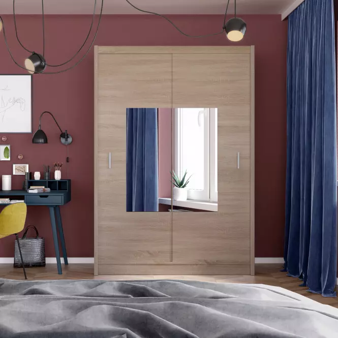 Wybarwienie w tonacji dąb sonoma dodaje szafie przytulności i ciepła, wprowadzając do wnętrza naturalne, drewnopodobne akcenty. Zarówno fronty, jak i korpus wykonane są w matowym wykończeniu, co nadaje szafie subtelnej elegancji, unikając nadmiernego połysku. Materiały użyte do jej produkcji, czyli płyta wiórowa laminowana, są trwałe i odporne na codzienne użytkowanie, a jednocześnie łatwe do utrzymania w czystości, co przekłada się na długowieczność mebla.