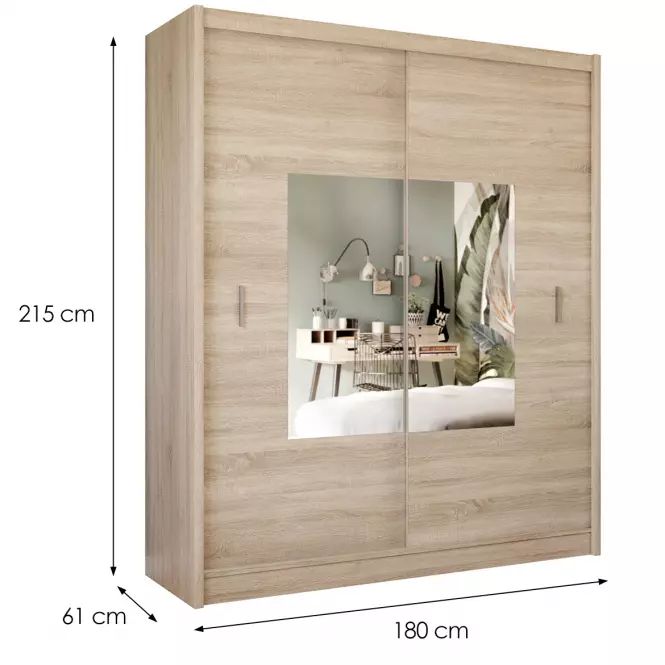 Szafa wyposażona jest w duże lustro na jednym z frontów, co nie tylko dodaje jej elegancji, ale również optycznie powiększa przestrzeń. Lustro jest szczególnie praktyczne w sypialni czy garderobie, umożliwiając szybkie przejrzenie się przed wyjściem. Połączenie funkcji lustra i pojemnej szafy czyni ten model idealnym rozwiązaniem dla osób, które chcą maksymalnie wykorzystać przestrzeń swojego domu.