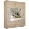 Szafa wyposażona jest w duże lustro na jednym z frontów, co nie tylko dodaje jej elegancji, ale również optycznie powiększa przestrzeń. Lustro jest szczególnie praktyczne w sypialni czy garderobie, umożliwiając szybkie przejrzenie się przed wyjściem. Połączenie funkcji lustra i pojemnej szafy czyni ten model idealnym rozwiązaniem dla osób, które chcą maksymalnie wykorzystać przestrzeń swojego domu.