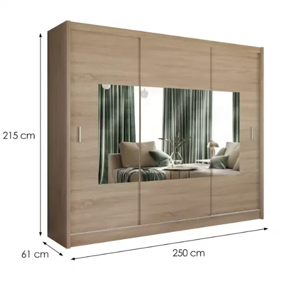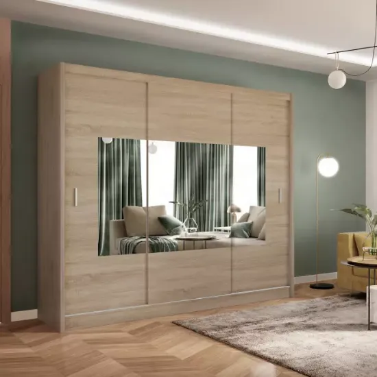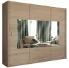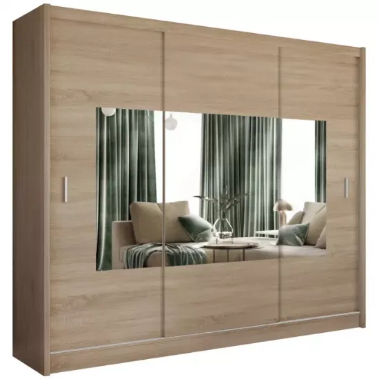 Szafa wyposażona jest w duże lustro na jednym z frontów, co nie tylko dodaje jej elegancji, ale również optycznie powiększa przestrzeń. Lustro jest szczególnie praktyczne w sypialni czy garderobie, umożliwiając szybkie przejrzenie się przed wyjściem. Połączenie funkcji lustra i pojemnej szafy czyni ten model idealnym rozwiązaniem dla osób, które chcą maksymalnie wykorzystać przestrzeń swojego domu.