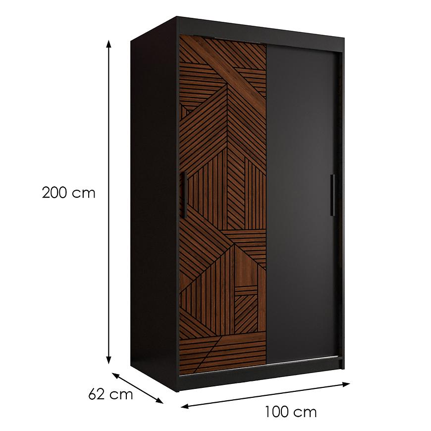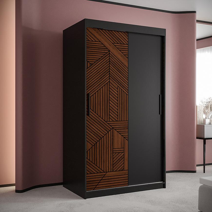 Estetyczne połączenie kolorystyczne czerni z elementami w kolorze ciemny orzech nadaje szafie unikalny charakter. Charakterystyczny geometryczny dekor na froncie to wyrafinowany akcent, który nadaje meblowi indywidualny styl.