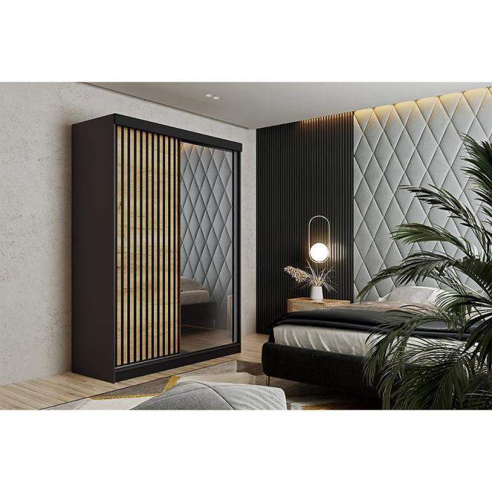 Szafa przesuwna Malani to propozycja do pokoju dziennego, ale znajdzie swoje miejsce również w innym pomieszczeniu, jak na przykład - przedpokój czy garderobie. Materiał wykonania to płyta wiórowa laminowana. Szafa posiada półki oraz drążek na ubrania. Mebel posiada lustro, które sprawi, że pomieszczenie stanie się optycznie większe. Nowoczesny styl mebli wpadnie do gustu każdemu, kto poszukuje eleganckiego, klasycznego, a zarazem nowoczesnego umeblowania. Idealnie wpasuje się w większość aranżacji. Przeznaczona do samodzielnego montażu.