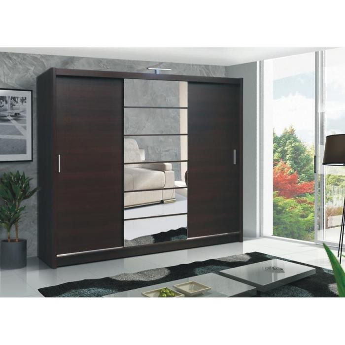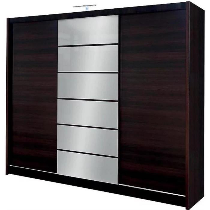 Szafa w kolorze wenge z kolekcji Malibu to doskonała propozycja do pokoju dziennego, ale znajdzie swoje miejsce również w innym pomieszczeniu, jak na przykład - przedpokój czy garderobie, sypialni. Materiał wykonania to płyta laminowana. Szafa posiada półki, drążek na ubrania oraz szuflady. Dodatkowym atutem jest oświetlenie w zestawie. Duża szafa posiada również lustro, które sprawi, że pomieszczenie stanie się optycznie większe. Szafa będzie świetnym miejscem do wieszania ubrań, na buty lub inne domowe tekstylia. Nowoczesny styl mebli wpadnie do gustu każdemu, kto poszukuje eleganckiego, klasycznego, a zarazem nowoczesnego umeblowania. Idealnie wpasuje się w większość aranżacji. Szafa przeznaczona do samodzielnego montażu.