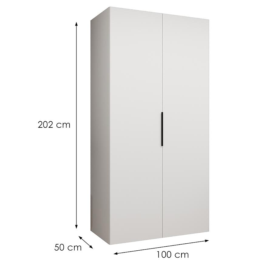 Dzięki szerokości 100 cm, wysokości 202 cm oraz głębokości 50 cm, szafa oferuje dużą pojemność przy zachowaniu kompaktowych proporcji. To rozwiązanie, które pozwala na wygodne przechowywanie odzieży i akcesoriów, bez przytłaczania przestrzeni. Model ten należy do kategorii szafy dwudrzwiowe bez lustra, co czyni go dobrym wyborem dla osób poszukujących jednolitej, spokojnej stylistyki.