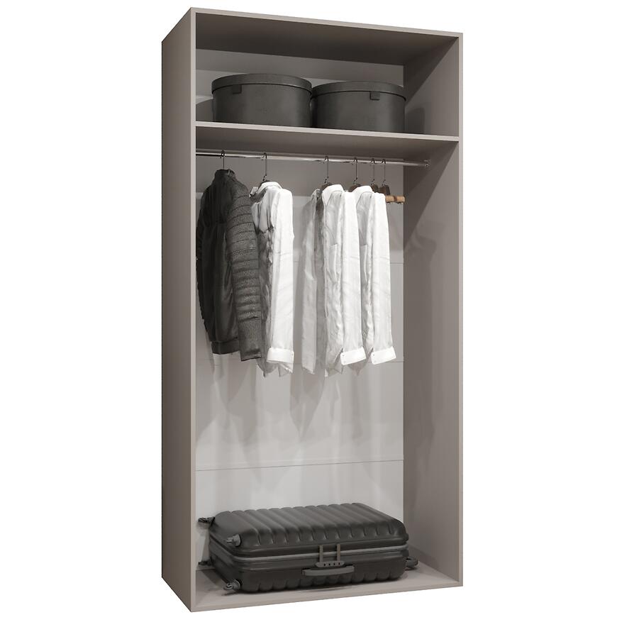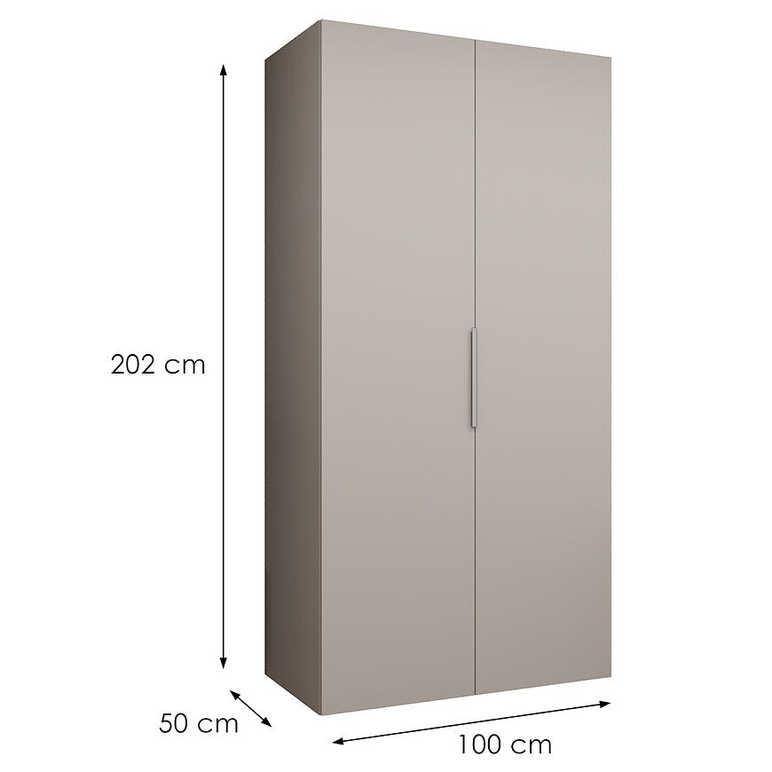 Dzięki wymiarom 100 cm szerokości, 202 cm wysokości i 50 cm głębokości, szafa oferuje przestrzeń do przechowywania w kompaktowej i proporcjonalnej formie. Model należy do kategorii szaf dwudrzwiowych bez lustra, co sprawia, że bryła pozostaje minimalistyczna i estetyczna.