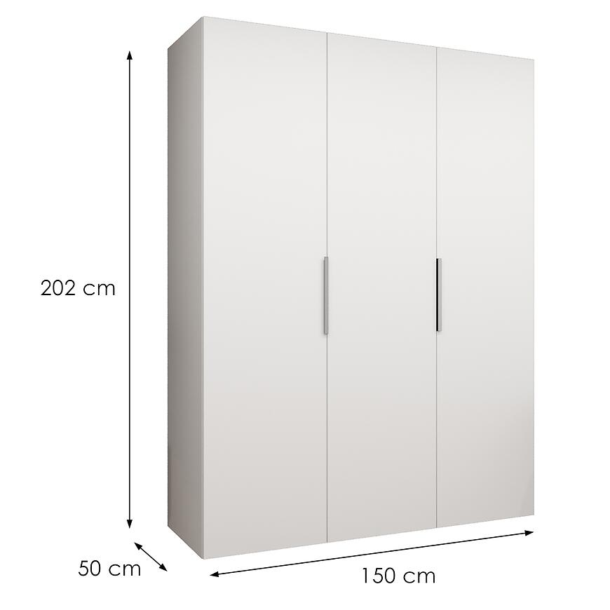 Dzięki wymiarom 150 cm szerokości, 202 cm wysokości i 50 cm głębokości, szafa oferuje dużą przestrzeń do przechowywania przy zachowaniu kompaktowej formy. Model należy do kategorii szaf trzydrzwiowych bez lustra, dzięki czemu bryła pozostaje minimalistyczna i estetyczna.