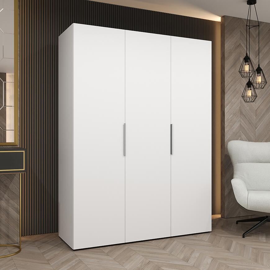 Szafa Marbella I 150 biały/srebrny to propozycja dla osób poszukujących trzydrzwiowej szafy 150 cm w nowoczesnym stylu, z matowym wykończeniem, srebrnymi detalami i trwałą, stabilną konstrukcją.