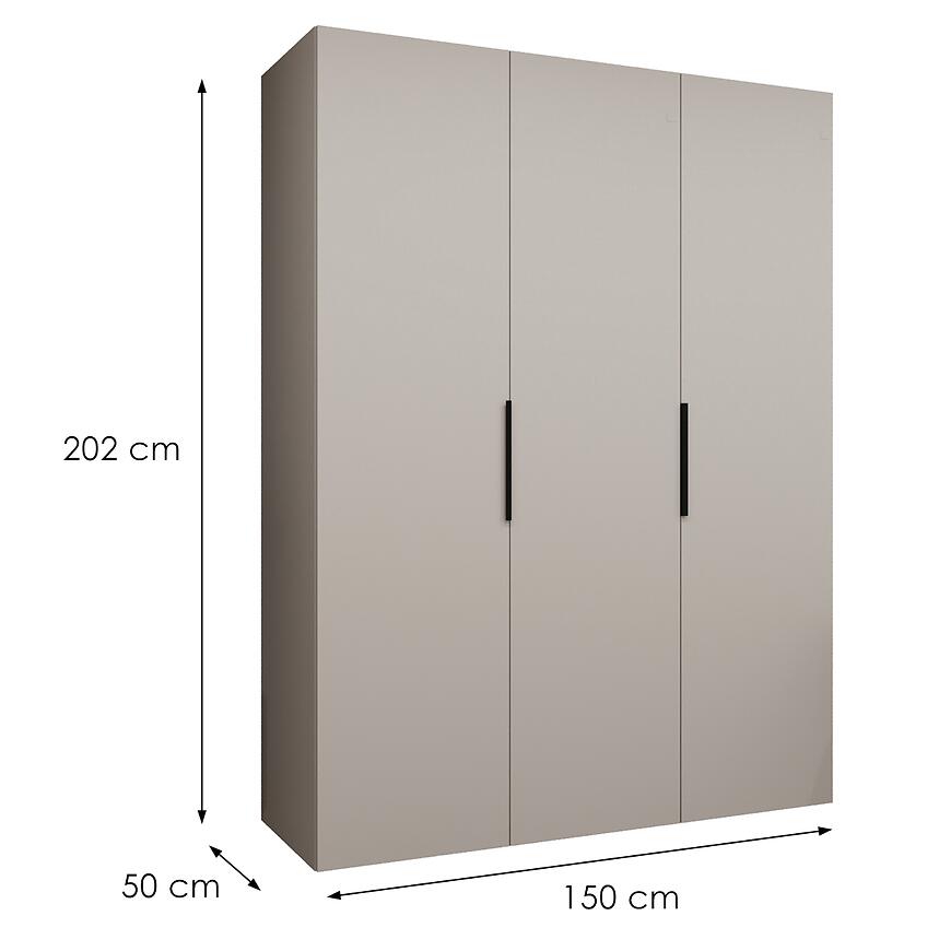 Dzięki wymiarom 150 cm szerokości, 202 cm wysokości i 50 cm głębokości, szafa oferuje dużą przestrzeń do przechowywania przy zachowaniu kompaktowej formy. Model należy do kategorii szaf trzydrzwiowych bez lustra, co pozwala zachować jednolity, minimalistyczny wygląd bryły.