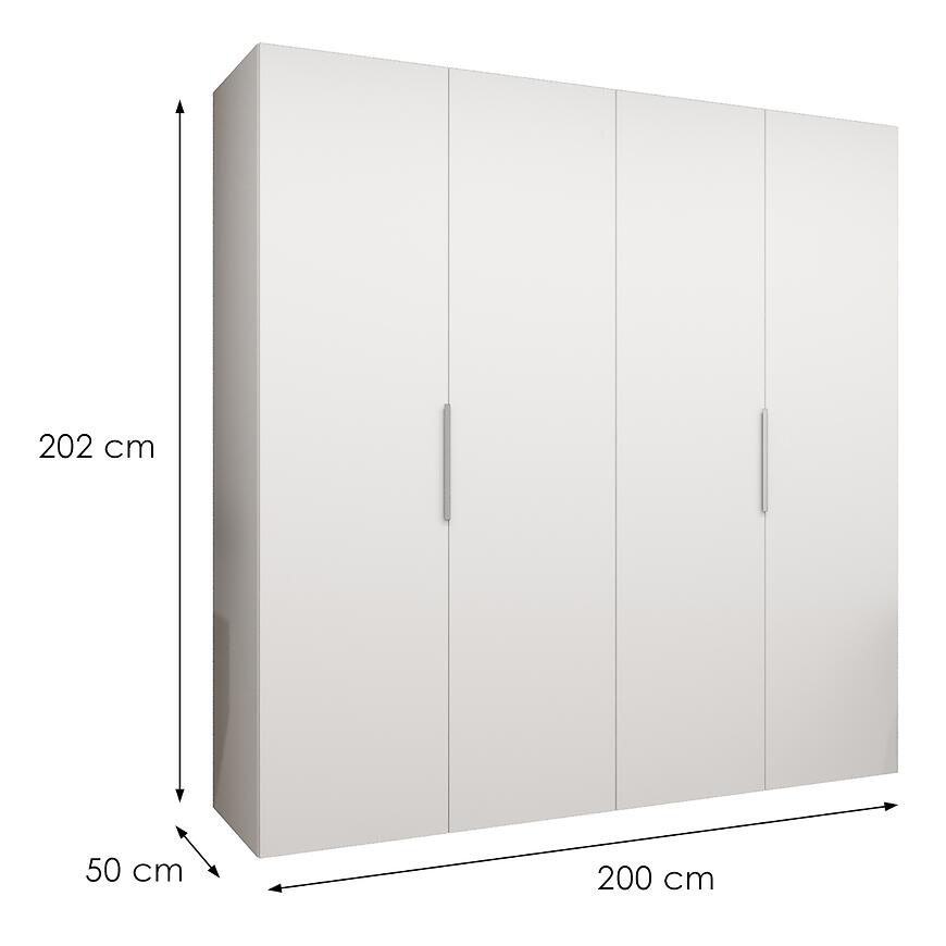 Dzięki wymiarom 200 cm szerokości, 202 cm wysokości i 50 cm głębokości, szafa oferuje ogromną przestrzeń do przechowywania przy zachowaniu proporcjonalnej formy. Model należy do kategorii szaf kilkudrzwiowych bez lustra, co pozwala utrzymać minimalistyczny i elegancki wygląd bryły.