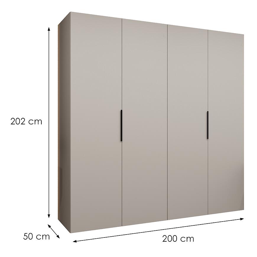 Dzięki wymiarom 200 cm szerokości, 202 cm wysokości i 50 cm głębokości, szafa oferuje ogromną przestrzeń do przechowywania przy zachowaniu proporcjonalnej formy. Model należy do kategorii szaf kilkudrzwiowych bez lustra, co pozwala utrzymać minimalistyczny i elegancki wygląd bryły.